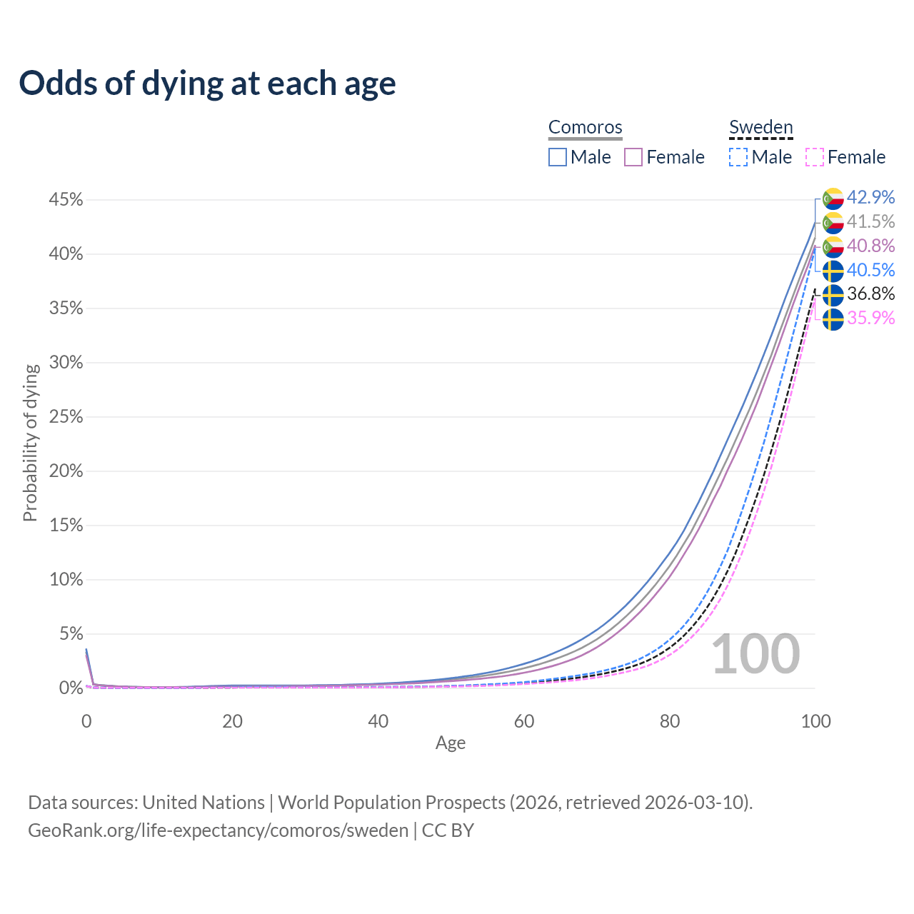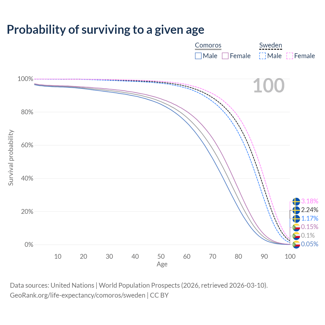 This life expectancy calculator shows the odds of living to 100, 95, 90, and below based on current age for both males and females in Comoros and Sweden, along with mean and median age of death. The calculations are based on the 2026 life tables (actuarial tables) from the UN World Population Prospects.