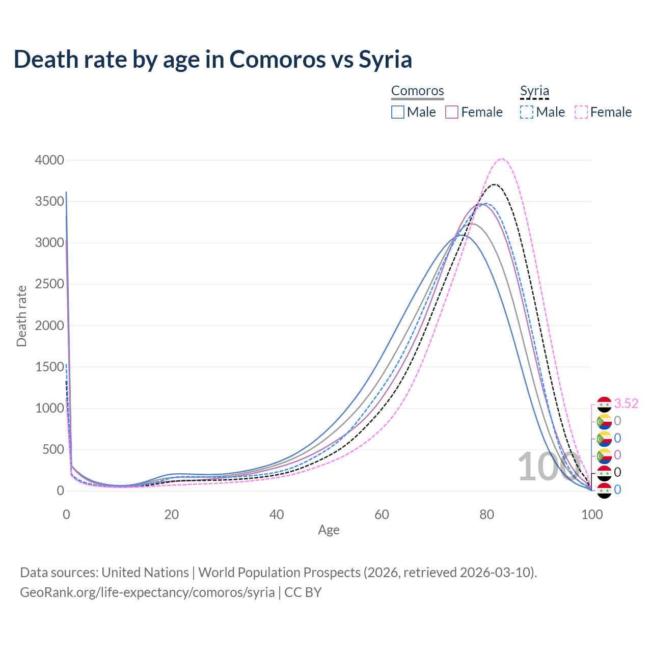 In Comoros, the most common age of death is 0, compared to 82 in Syria. The median age of death is 72.9 in Comoros and 77.7 in Syria, meaning only half of each cohort is expected to live past that age.