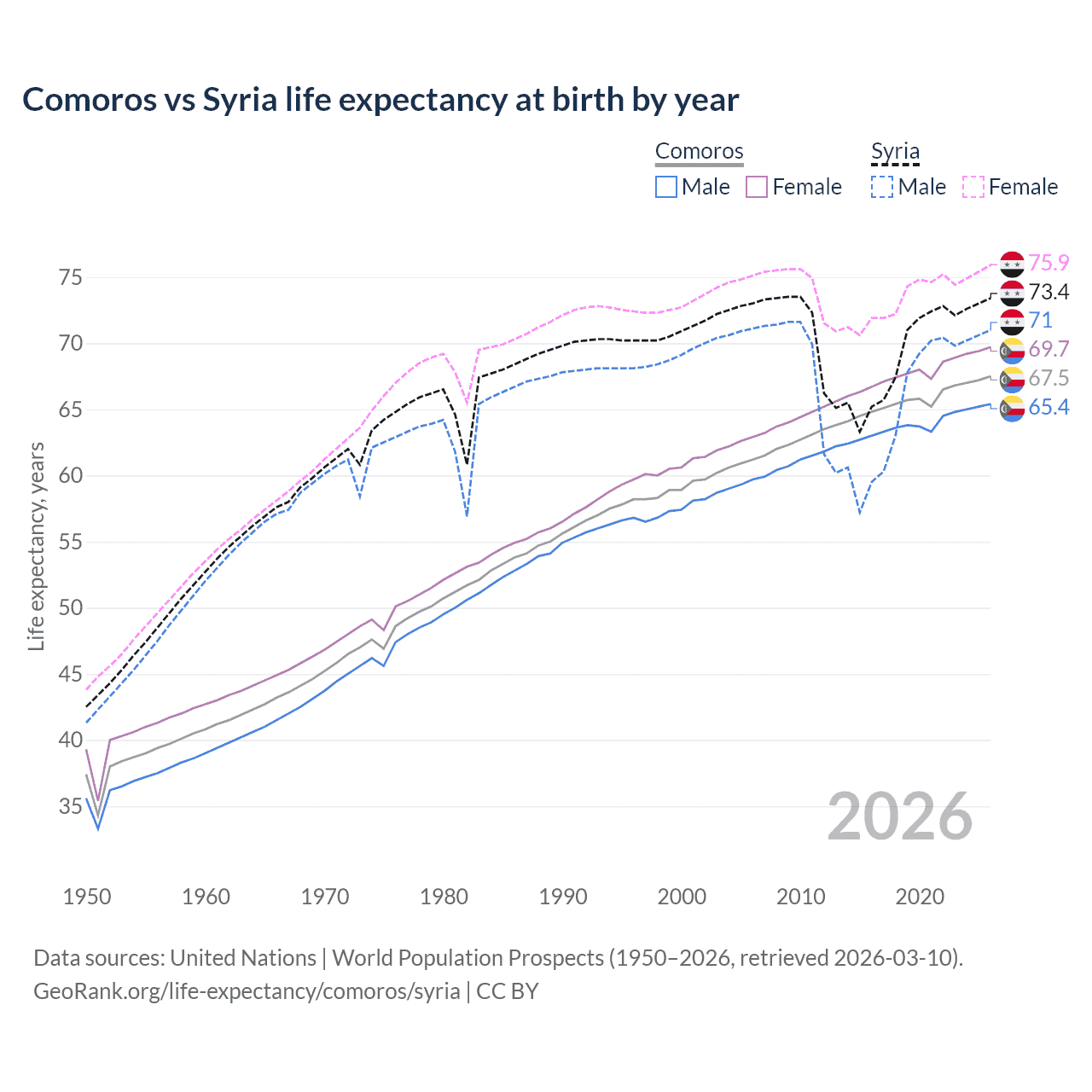 The average life expectancy at birth is 67.5 years in Comoros vs 73.4 in Syria. Comoros is ranked 158/197 by life expectancy, and Syria is 108/197. In Comoros, the life expectancy is 65.4 years for males and 69.7 years for females. In Syria, it's 71 years for males and 75.9 years for females.