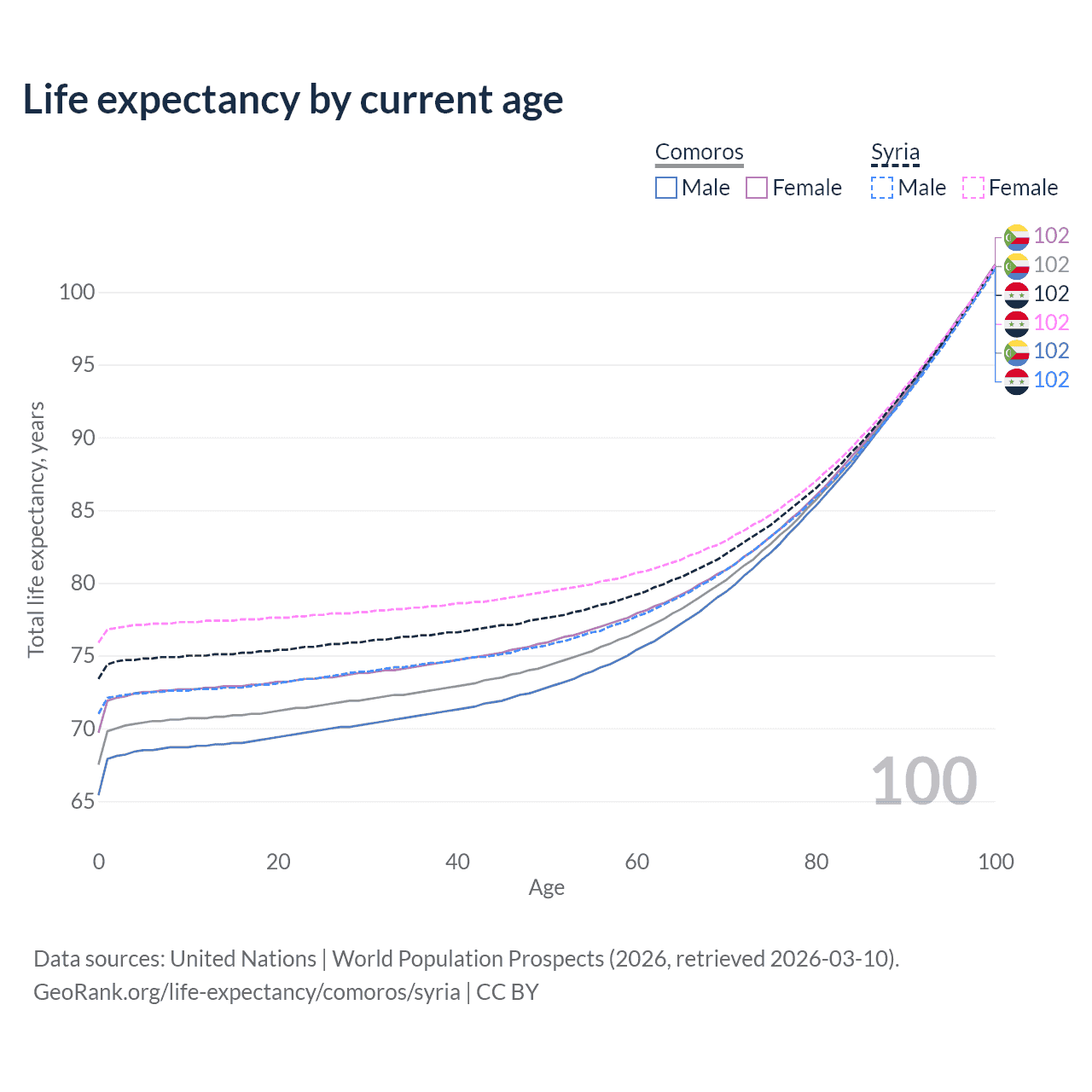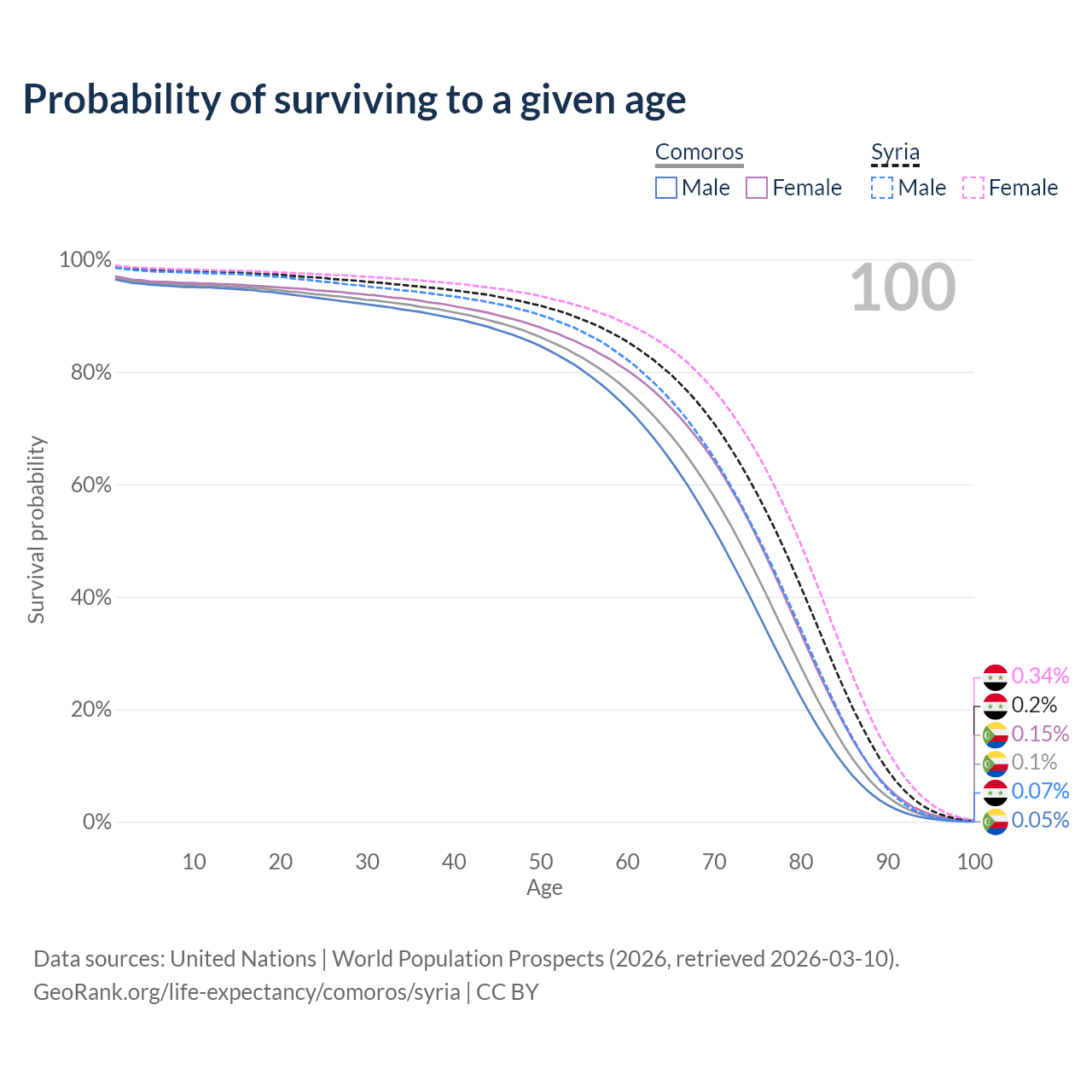 This life expectancy calculator shows the odds of living to 100, 95, 90, and below based on current age for both males and females in Comoros and Syria, along with mean and median age of death. The calculations are based on the 2026 life tables (actuarial tables) from the UN World Population Prospects.
