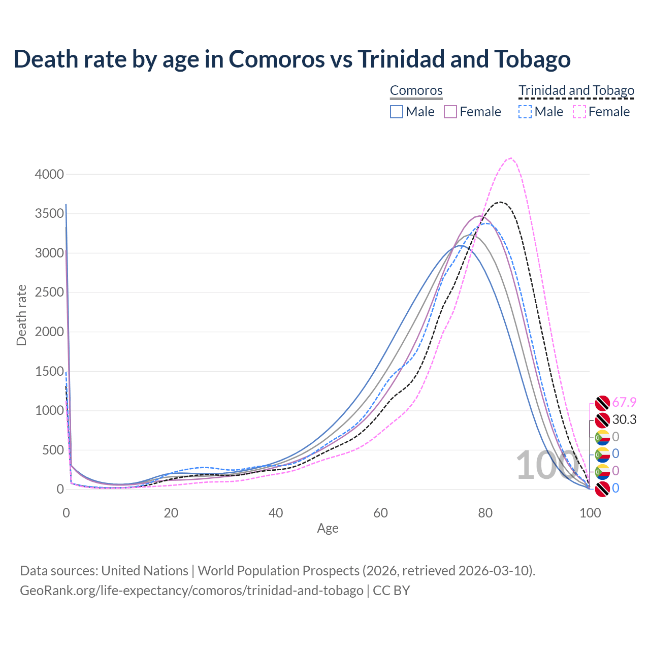 In Comoros, the most common age of death is 0, compared to 83 in Trinidad and Tobago. The median age of death is 72.9 in Comoros and 78.4 in Trinidad and Tobago, meaning only half of each cohort is expected to live past that age.