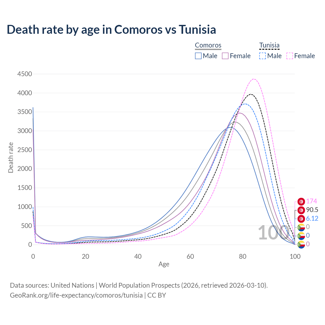 In Comoros, the most common age of death is 0, compared to 83 in Tunisia. The median age of death is 72.9 in Comoros and 80.2 in Tunisia, meaning only half of each cohort is expected to live past that age.