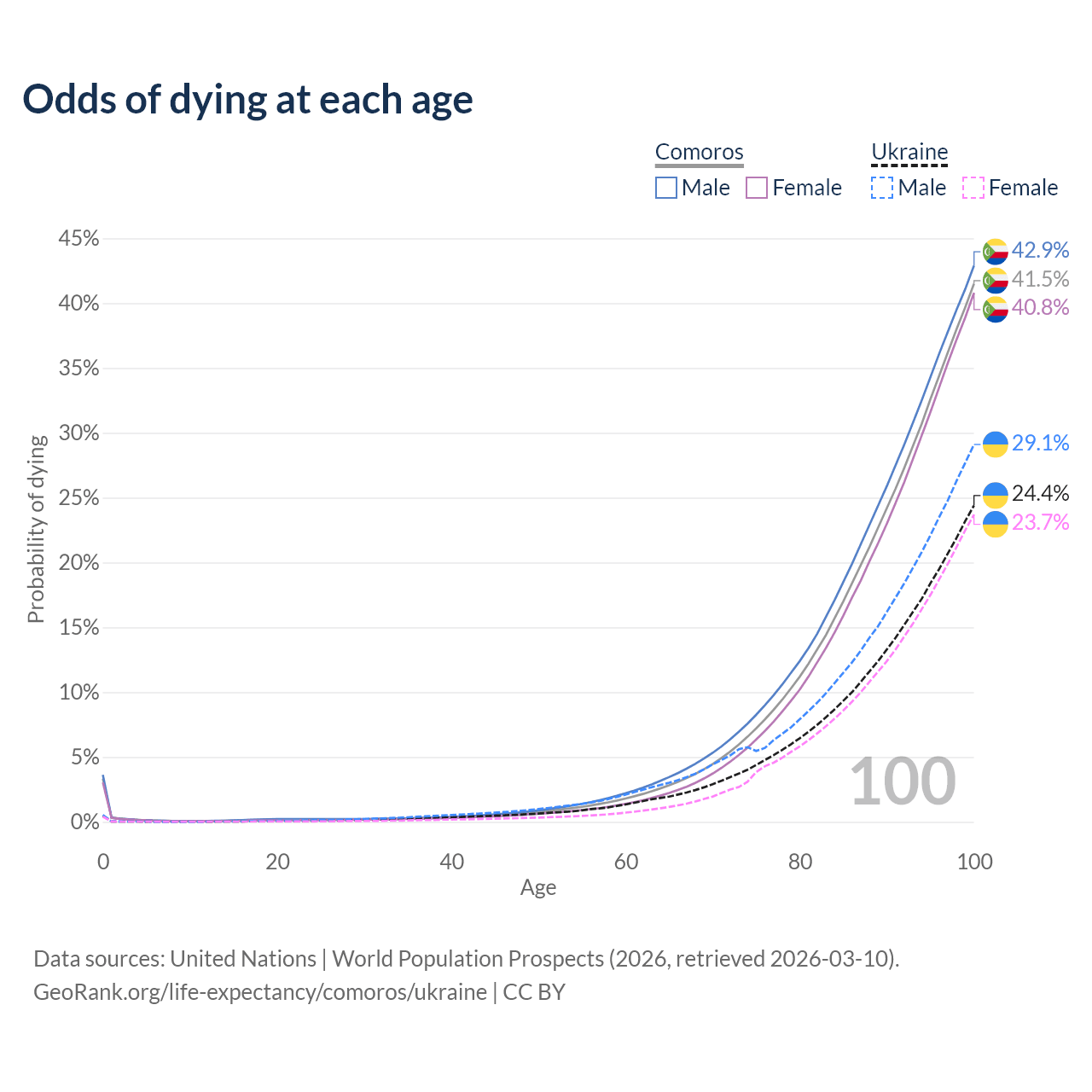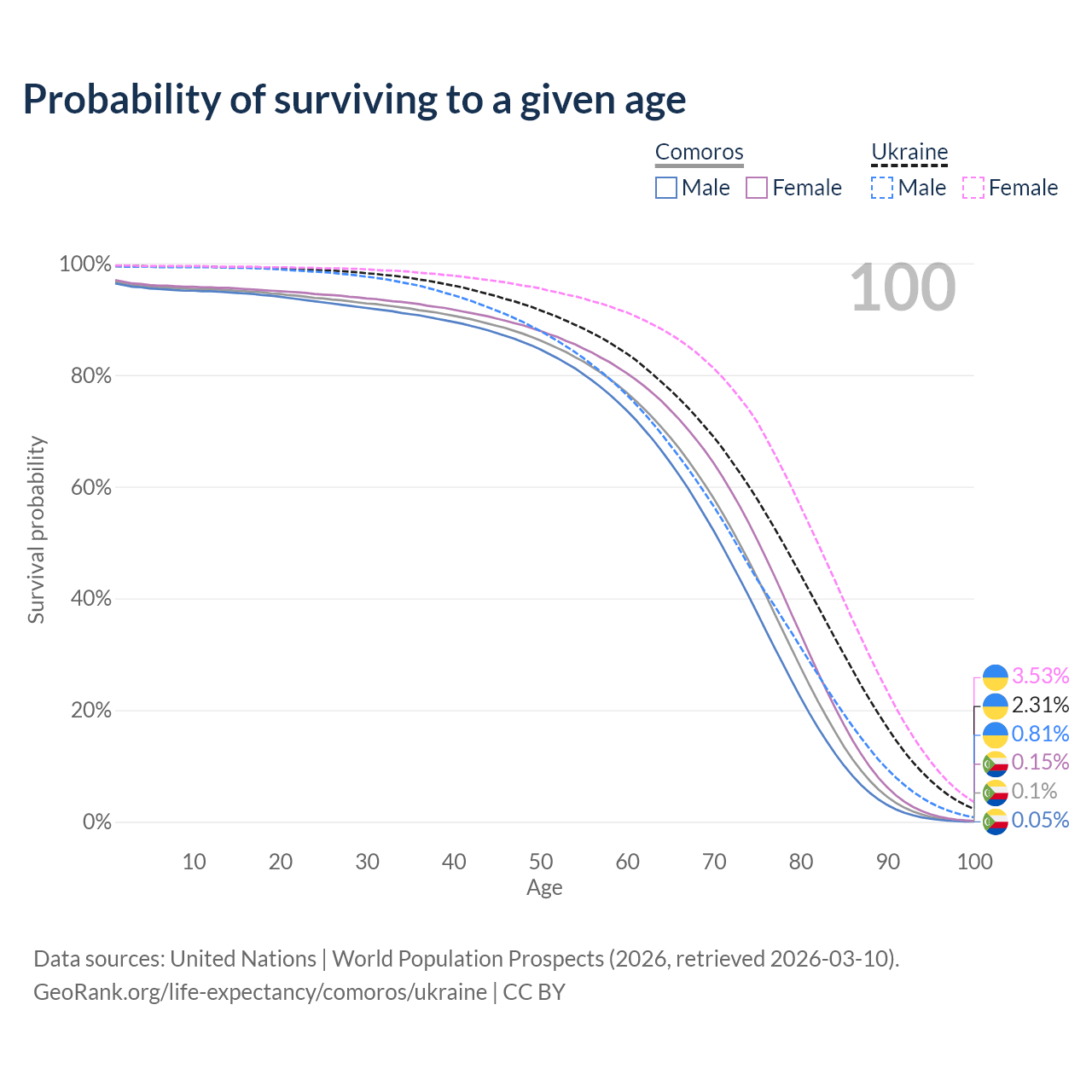 This life expectancy calculator shows the odds of living to 100, 95, 90, and below based on current age for both males and females in Comoros and Ukraine, along with mean and median age of death. The calculations are based on the 2026 life tables (actuarial tables) from the UN World Population Prospects.