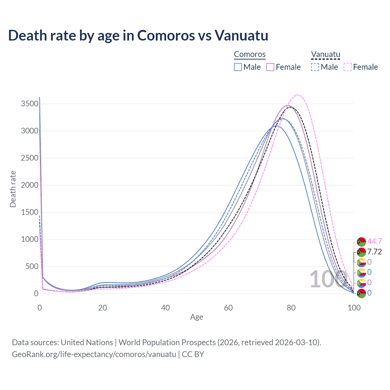 In Comoros, the most common age of death is 0, compared to 80 in Vanuatu. The median age of death is 72.9 in Comoros and 75.9 in Vanuatu, meaning only half of each cohort is expected to live past that age.