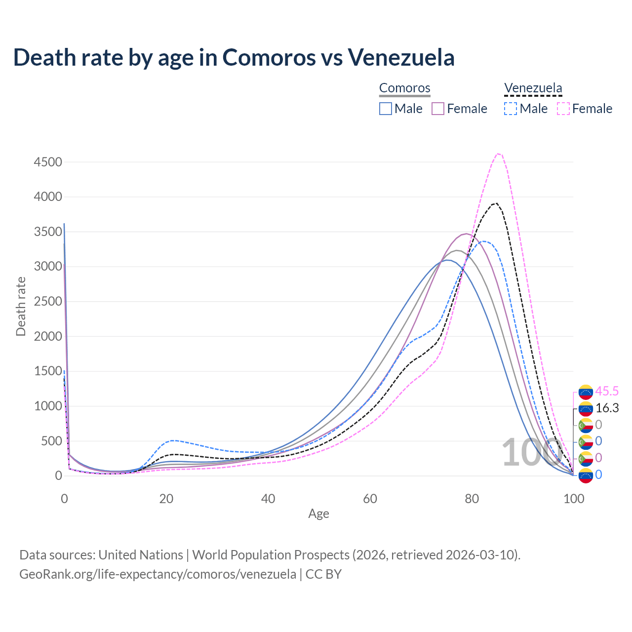 In Comoros, the most common age of death is 0, compared to 85 in Venezuela. The median age of death is 72.9 in Comoros and 79 in Venezuela, meaning only half of each cohort is expected to live past that age.