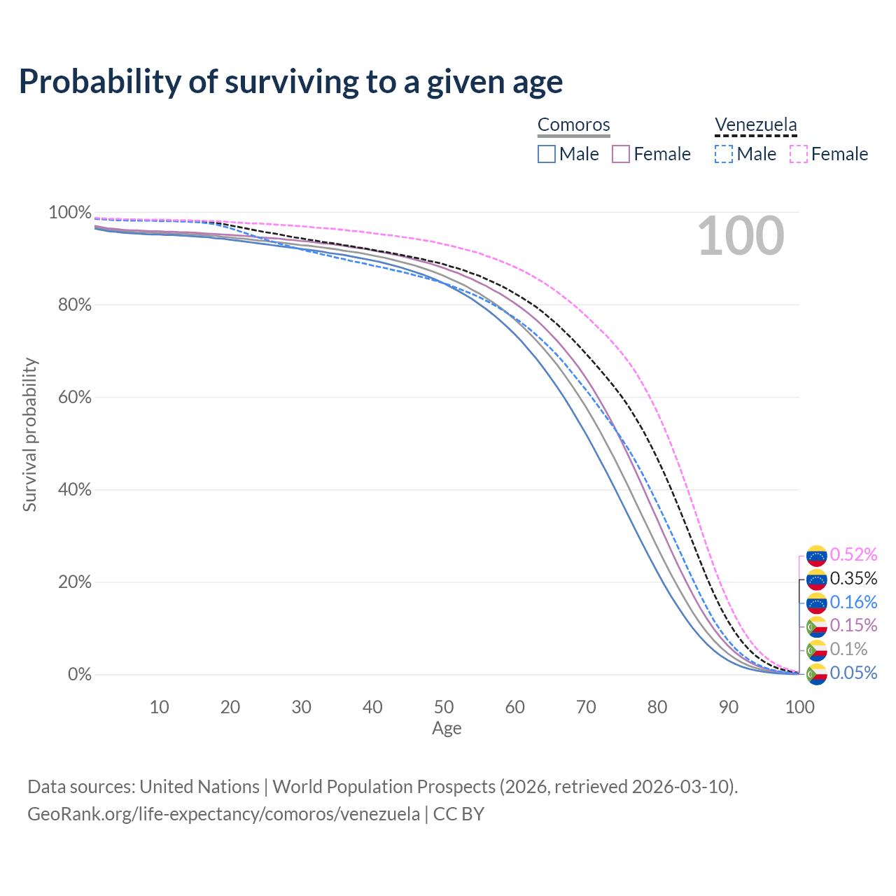 This life expectancy calculator shows the odds of living to 100, 95, 90, and below based on current age for both males and females in Comoros and Venezuela, along with mean and median age of death. The calculations are based on the 2026 life tables (actuarial tables) from the UN World Population Prospects.