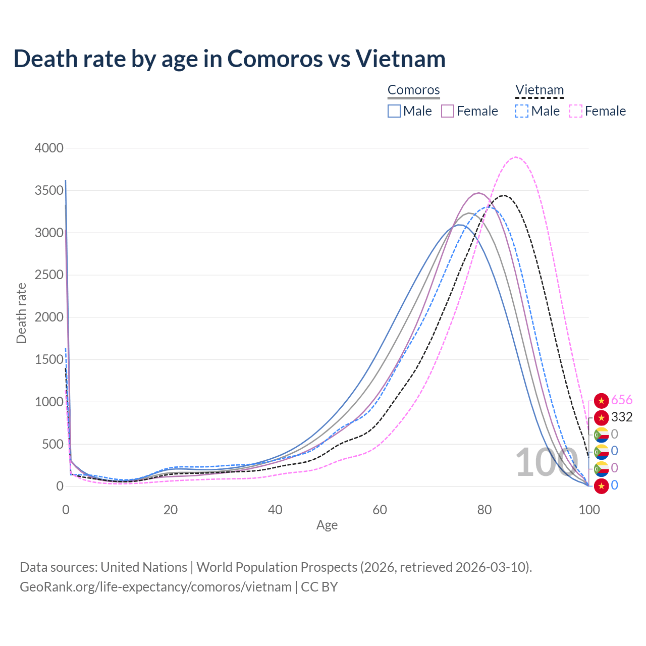This life expectancy calculator shows the odds of living to 100, 95, 90, and below based on current age for both males and females in Comoros and Vietnam, along with mean and median age of death. The calculations are based on the 2026 life tables (actuarial tables) from the UN World Population Prospects.