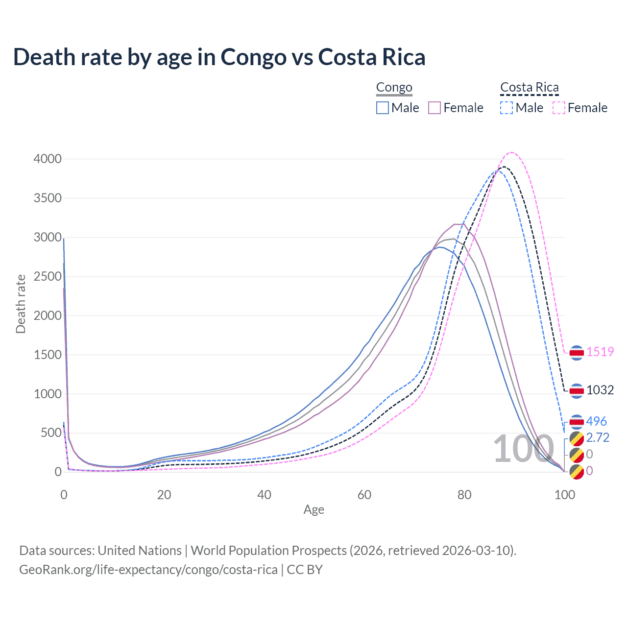 In the Congo, the most common age of death is 78, compared to 88 in Costa Rica. The median age of death is 71.8 in the Congo and 85 in Costa Rica, meaning only half of each cohort is expected to live past that age.