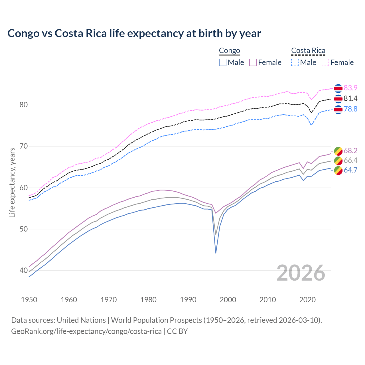The average life expectancy at birth is 66.4 years in the Congo vs 81.4 in Costa Rica. The Congo is ranked 168/197 by life expectancy, and Costa Rica is 39/197. In the Congo, the life expectancy is 64.7 years for males and 68.2 years for females. In Costa Rica, it's 78.8 years for males and 83.9 years for females.