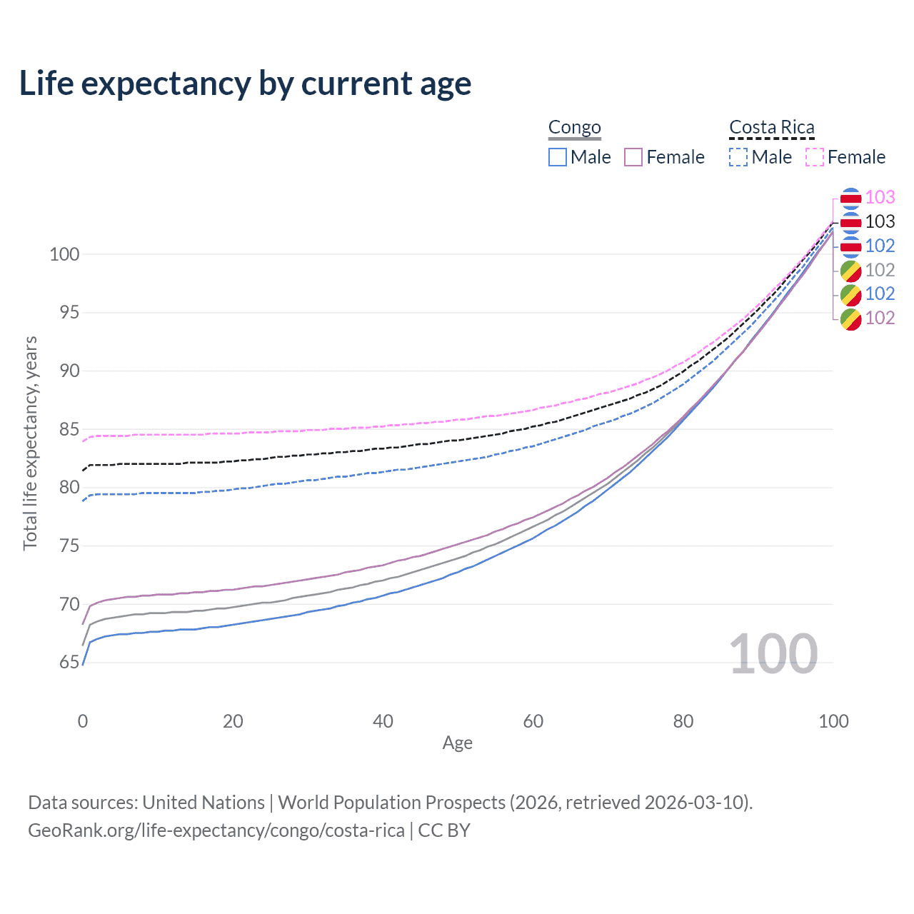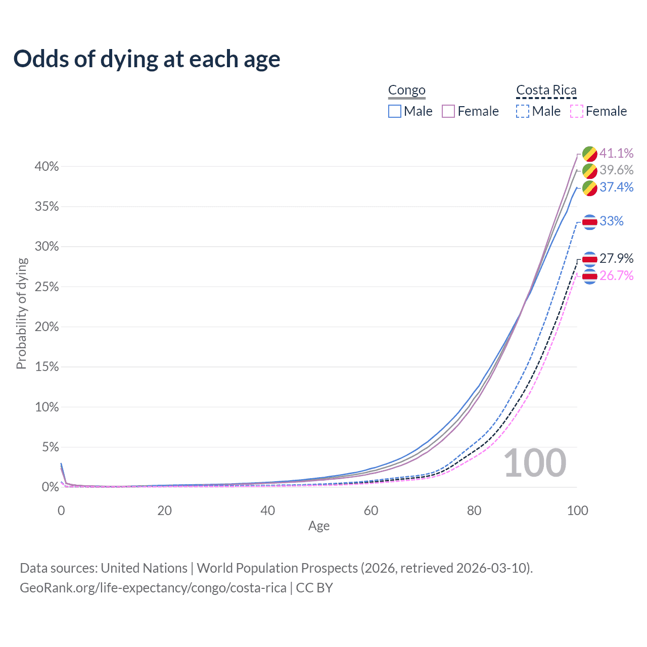 This life expectancy calculator shows the odds of living to 100, 95, 90, and below based on current age for both males and females in the Congo and Costa Rica, along with mean and median age of death. The calculations are based on the 2026 life tables (actuarial tables) from the UN World Population Prospects.
