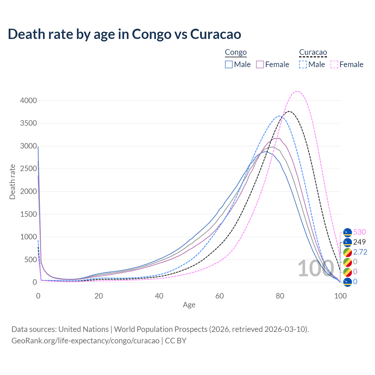 In the Congo, the most common age of death is 78, compared to 83 in Curacao. The median age of death is 71.8 in the Congo and 80.4 in Curacao, meaning only half of each cohort is expected to live past that age.