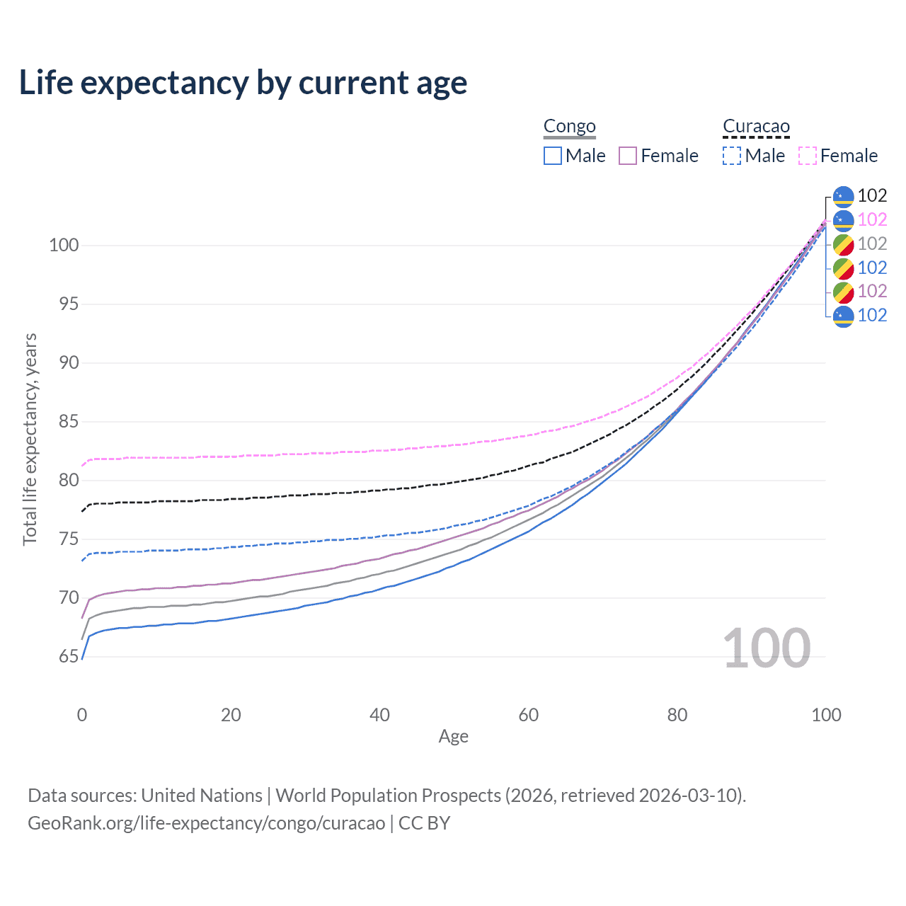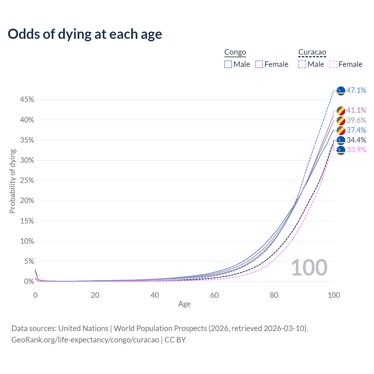 This life expectancy calculator shows the odds of living to 100, 95, 90, and below based on current age for both males and females in the Congo and Curacao, along with mean and median age of death. The calculations are based on the 2026 life tables (actuarial tables) from the UN World Population Prospects.