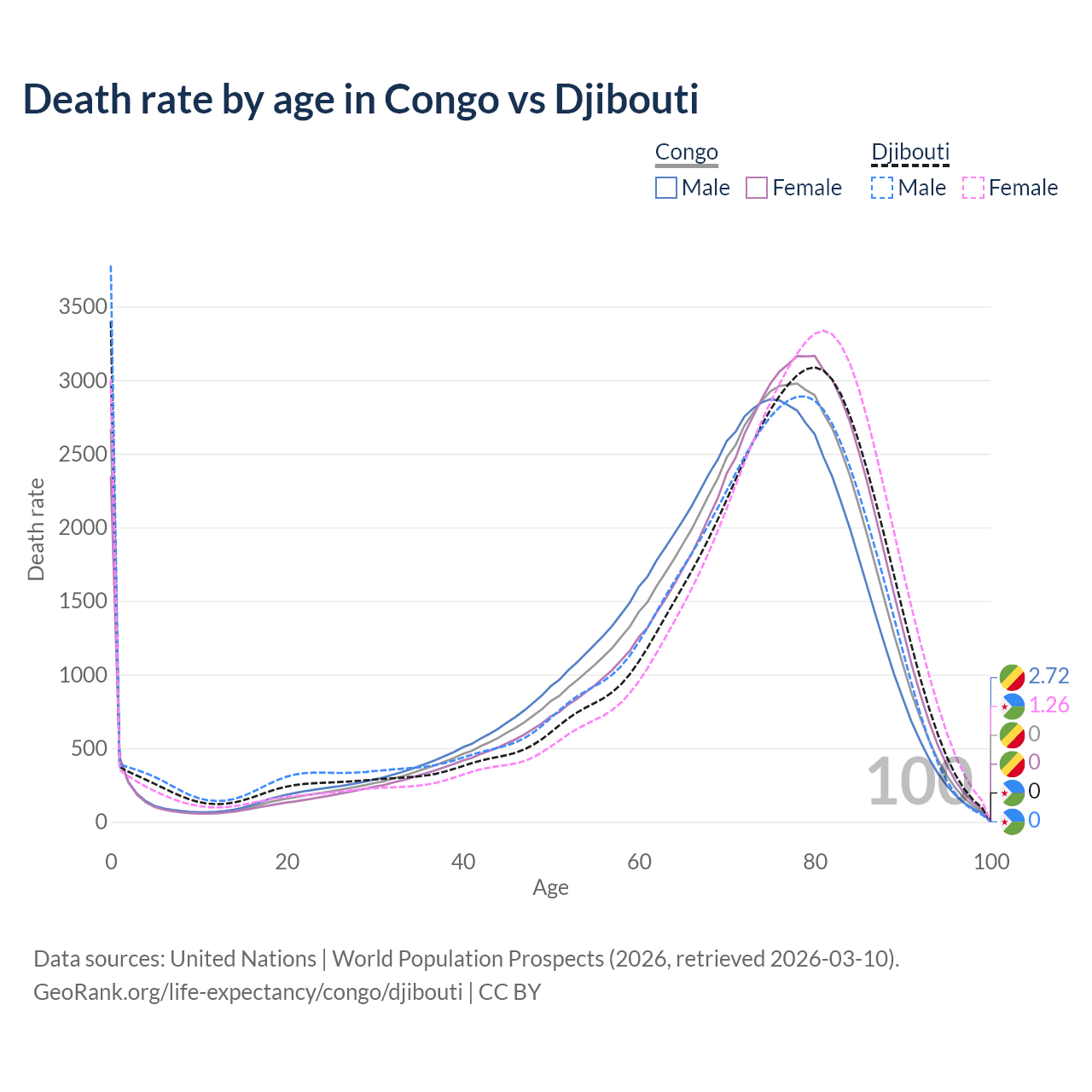 In the Congo, the most common age of death is 78, compared to 0 in Djibouti. The median age of death is 71.8 in the Congo and 73.7 in Djibouti, meaning only half of each cohort is expected to live past that age.