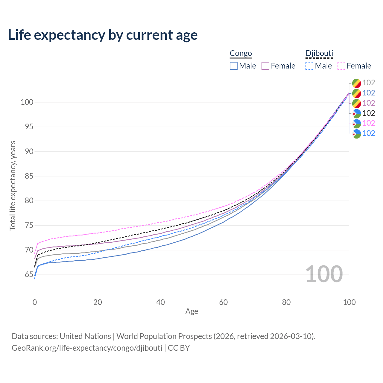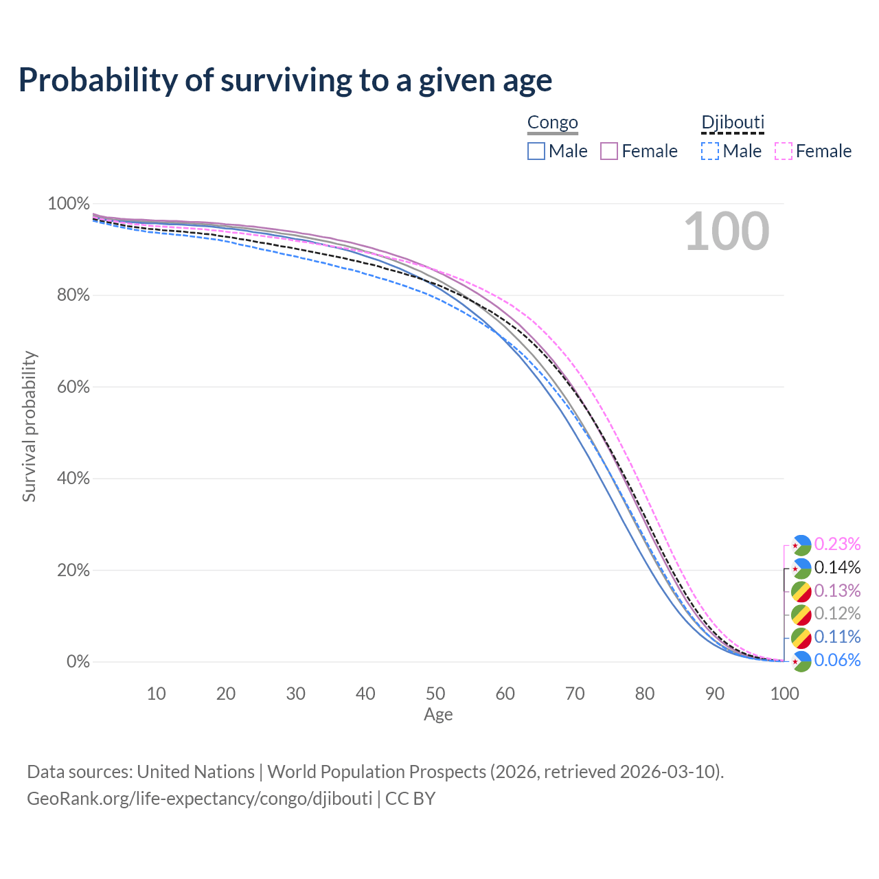 This life expectancy calculator shows the odds of living to 100, 95, 90, and below based on current age for both males and females in the Congo and Djibouti, along with mean and median age of death. The calculations are based on the 2026 life tables (actuarial tables) from the UN World Population Prospects.
