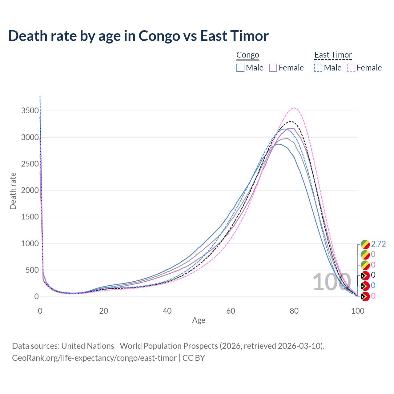 In the Congo, the most common age of death is 78, compared to 0 in East Timor. The median age of death is 71.8 in the Congo and 73.9 in East Timor, meaning only half of each cohort is expected to live past that age.