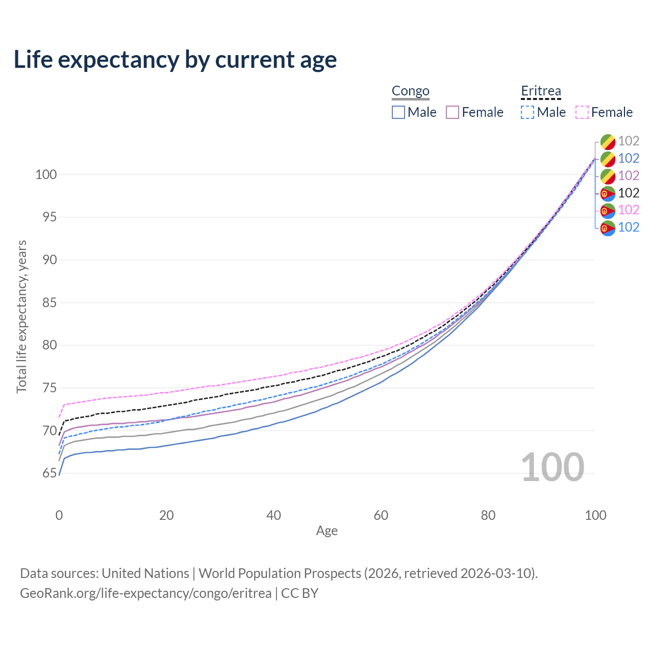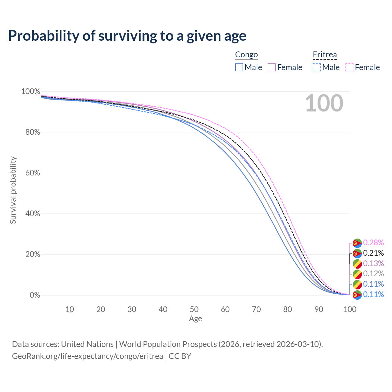 This life expectancy calculator shows the odds of living to 100, 95, 90, and below based on current age for both males and females in the Congo and Eritrea, along with mean and median age of death. The calculations are based on the 2026 life tables (actuarial tables) from the UN World Population Prospects.