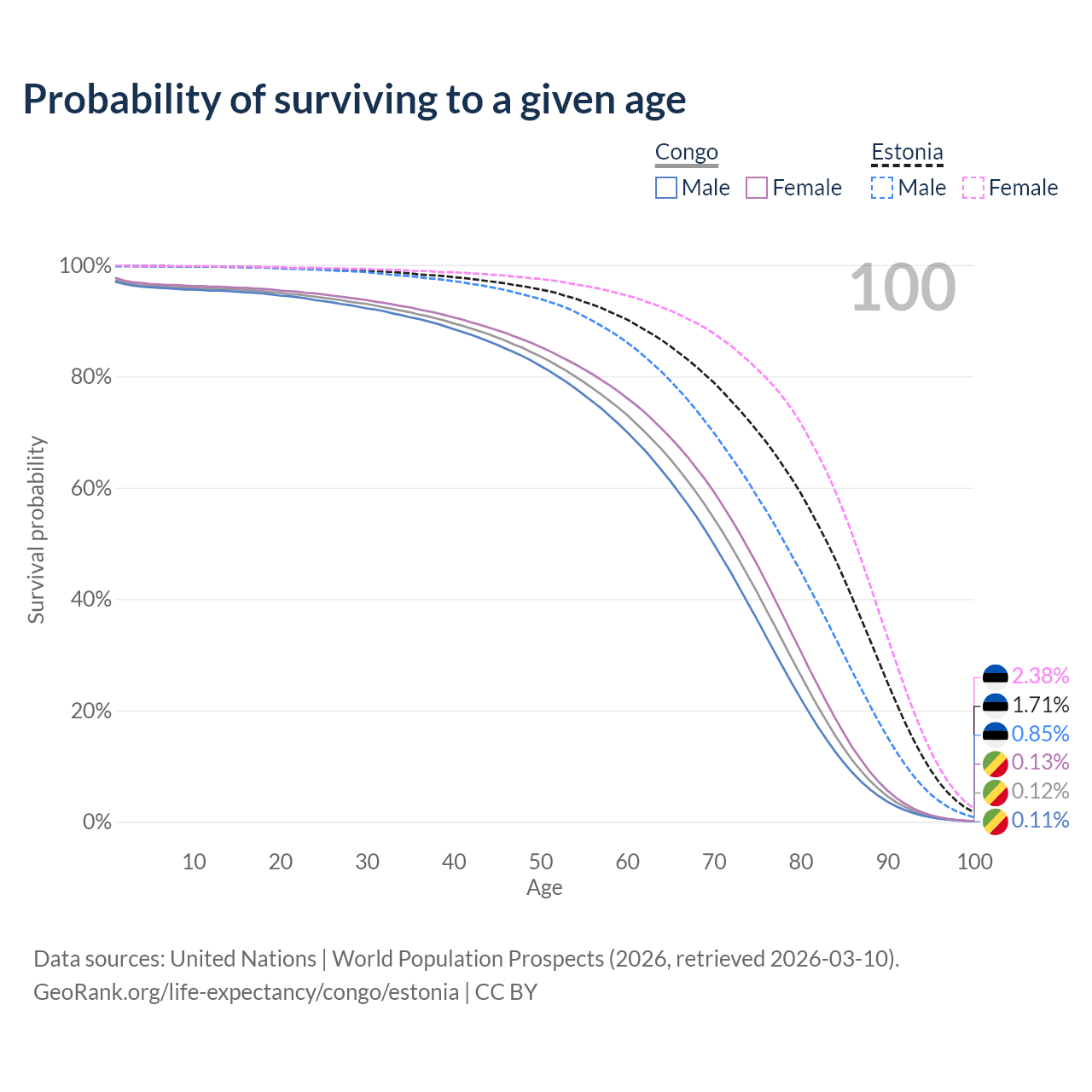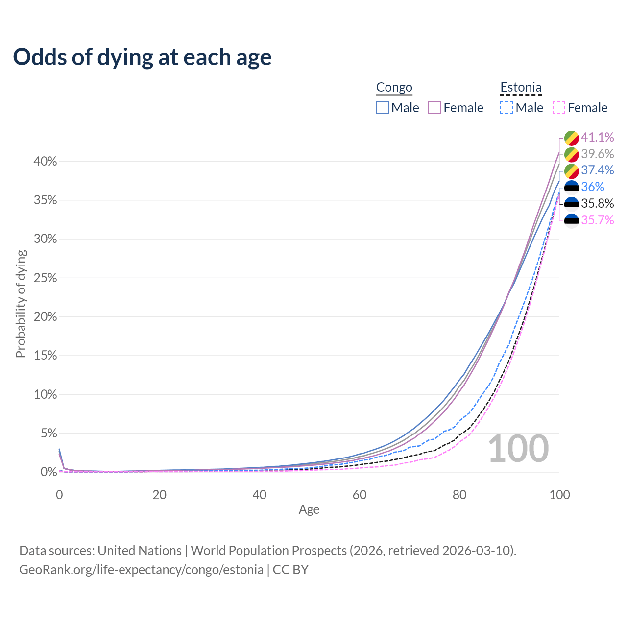 This life expectancy calculator shows the odds of living to 100, 95, 90, and below based on current age for both males and females in the Congo and Estonia, along with mean and median age of death. The calculations are based on the 2026 life tables (actuarial tables) from the UN World Population Prospects.