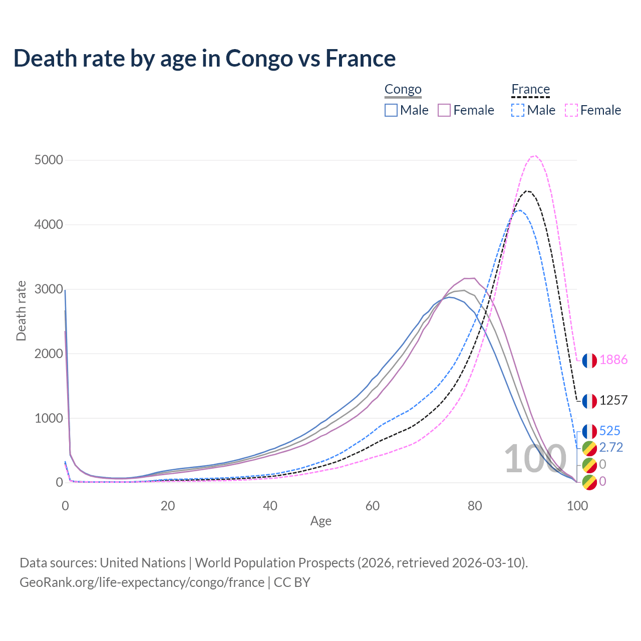In the Congo, the most common age of death is 78, compared to 90 in France. The median age of death is 71.8 in the Congo and 87.4 in France, meaning only half of each cohort is expected to live past that age.
