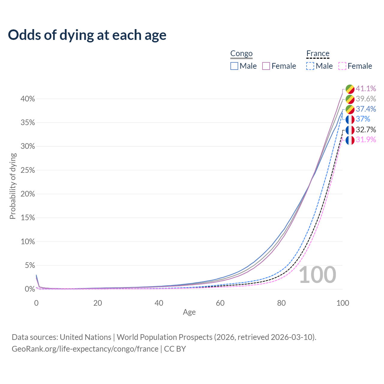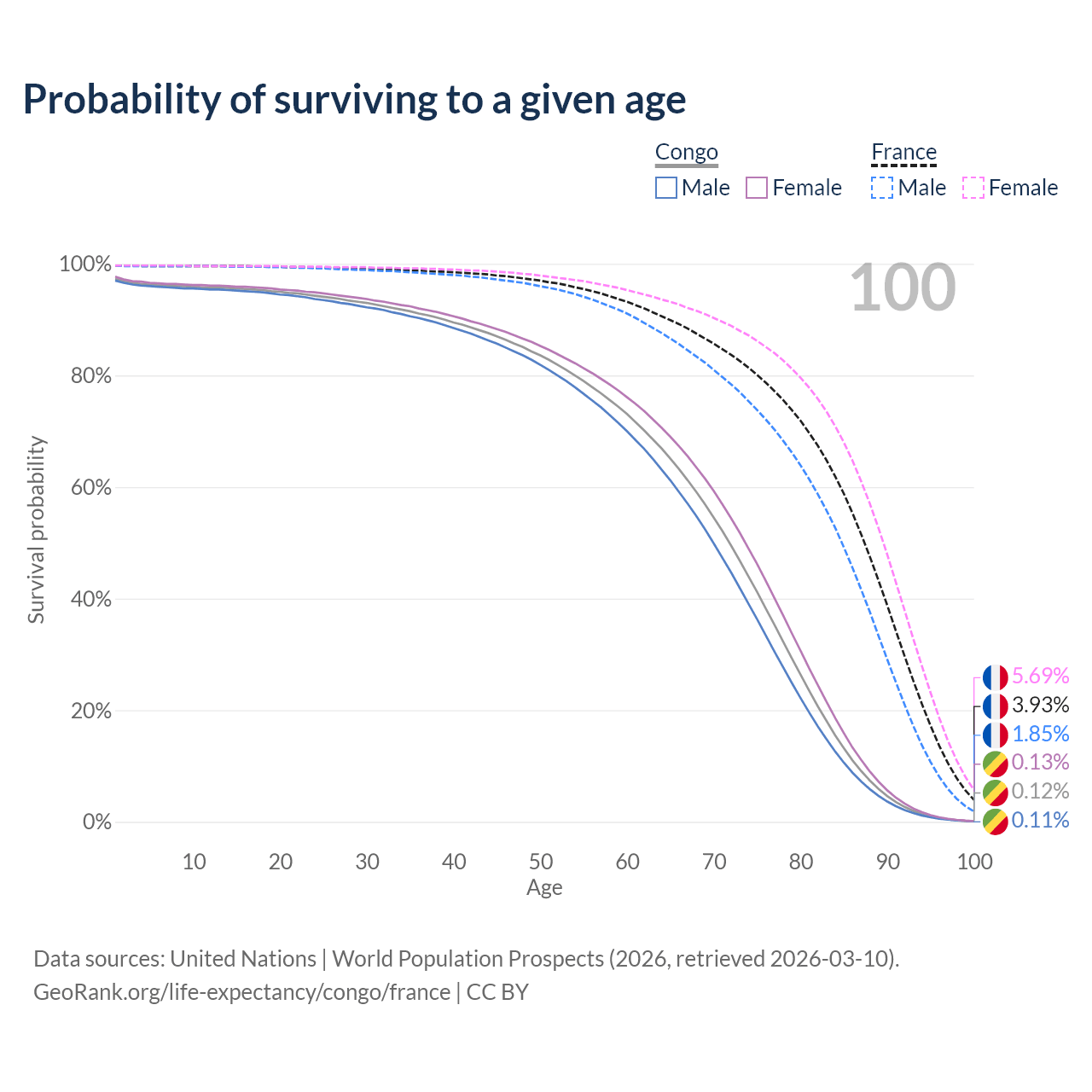 This life expectancy calculator shows the odds of living to 100, 95, 90, and below based on current age for both males and females in the Congo and France, along with mean and median age of death. The calculations are based on the 2026 life tables (actuarial tables) from the UN World Population Prospects.