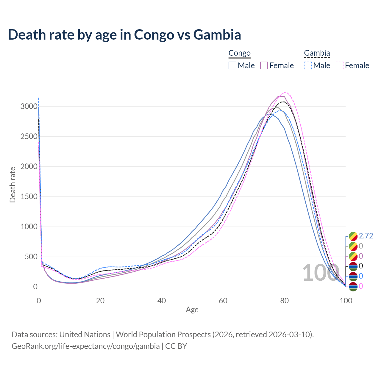 In the Congo, the most common age of death is 78, compared to 80 in the Gambia. The median age of death is 71.8 in the Congo and 73.4 in the Gambia, meaning only half of each cohort is expected to live past that age.