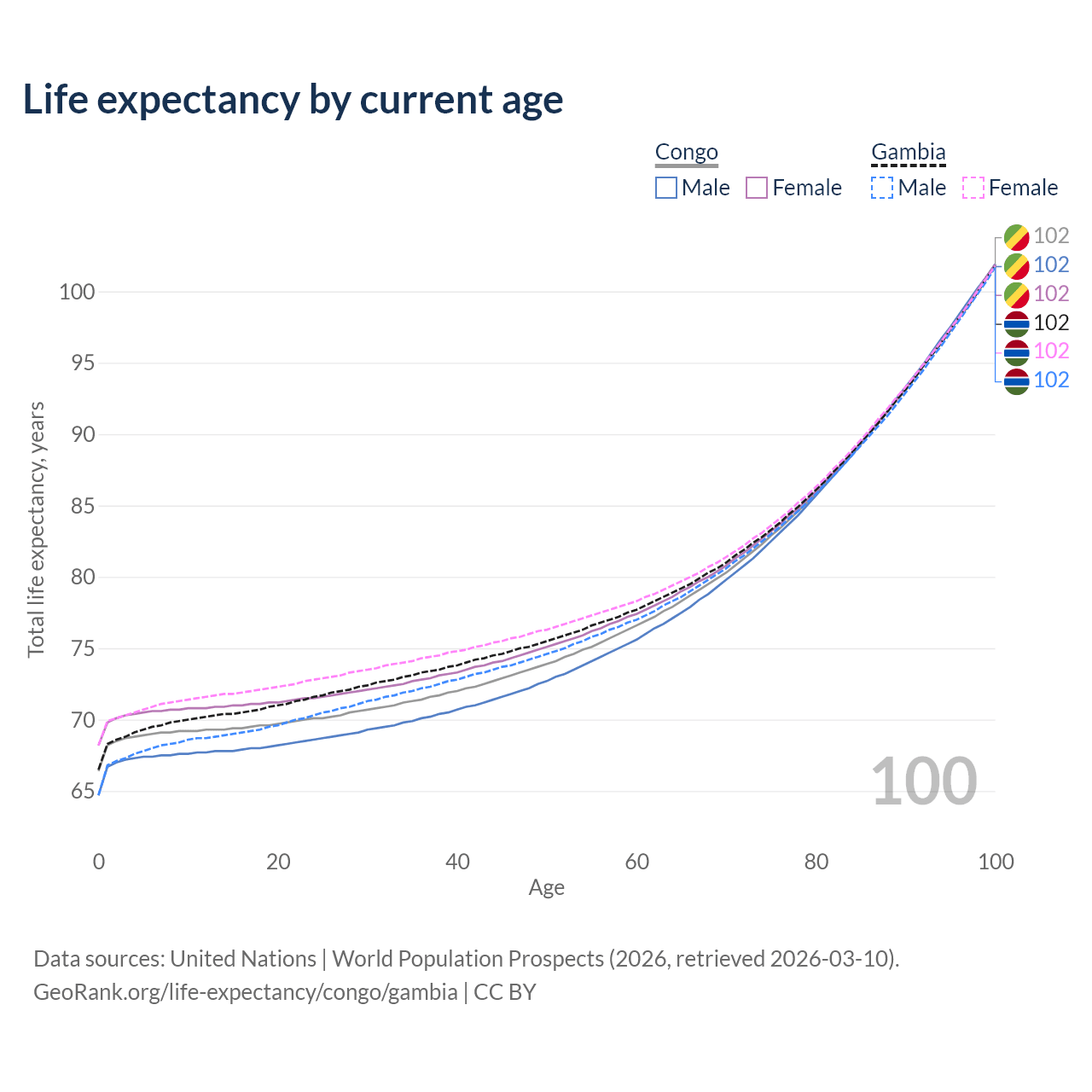 This life expectancy calculator shows the odds of living to 100, 95, 90, and below based on current age for both males and females in the Congo and the Gambia, along with mean and median age of death. The calculations are based on the 2026 life tables (actuarial tables) from the UN World Population Prospects.