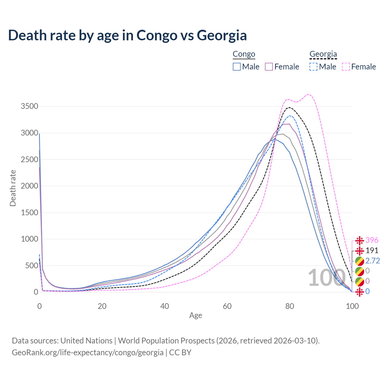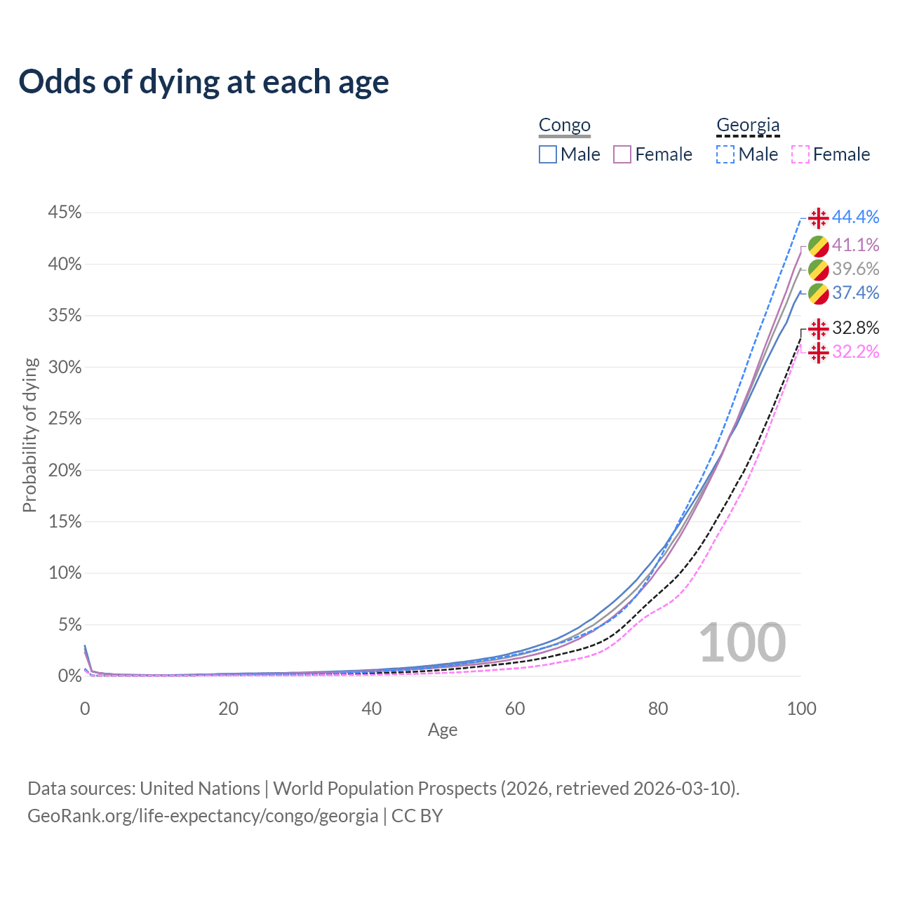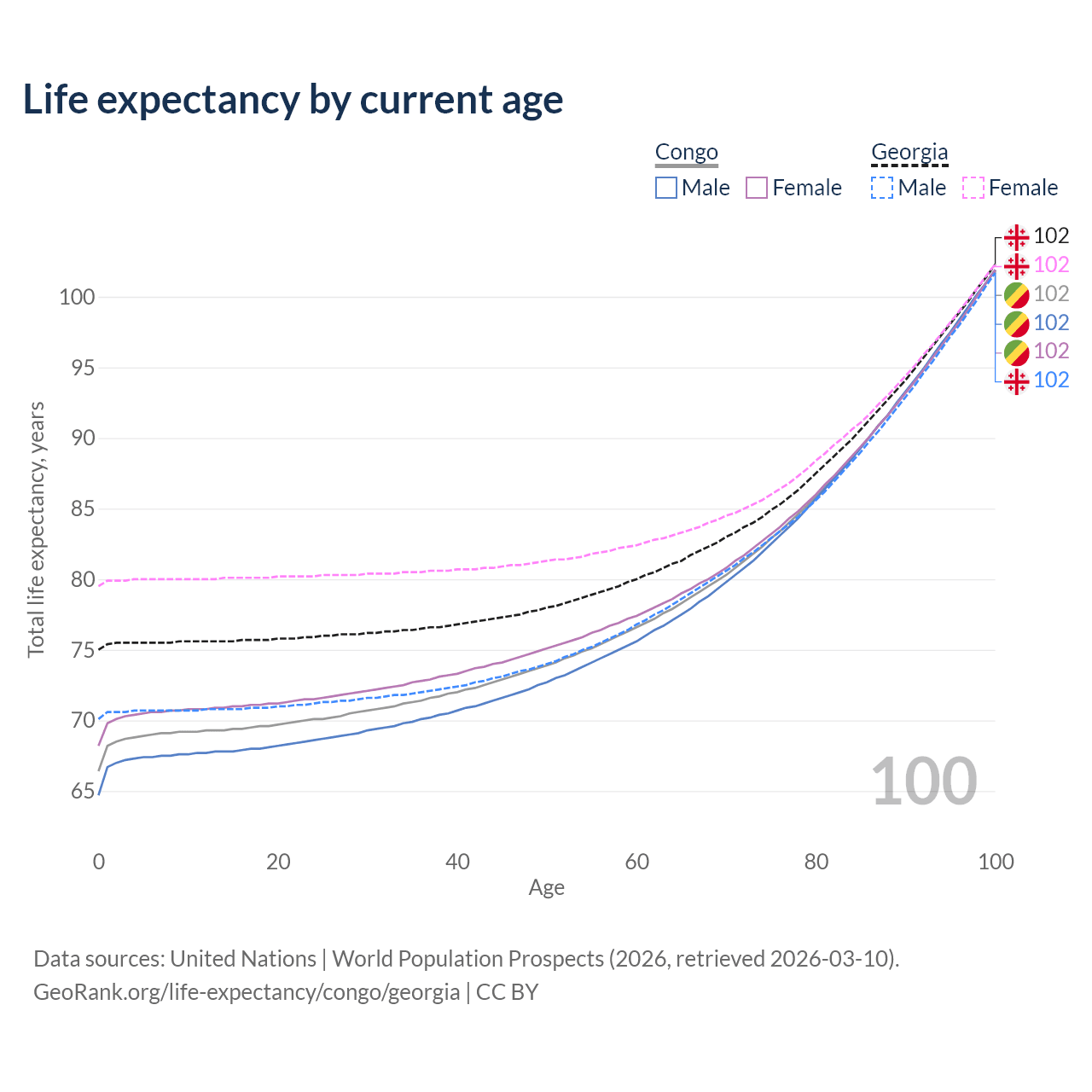 This life expectancy calculator shows the odds of living to 100, 95, 90, and below based on current age for both males and females in the Congo and Georgia, along with mean and median age of death. The calculations are based on the 2026 life tables (actuarial tables) from the UN World Population Prospects.