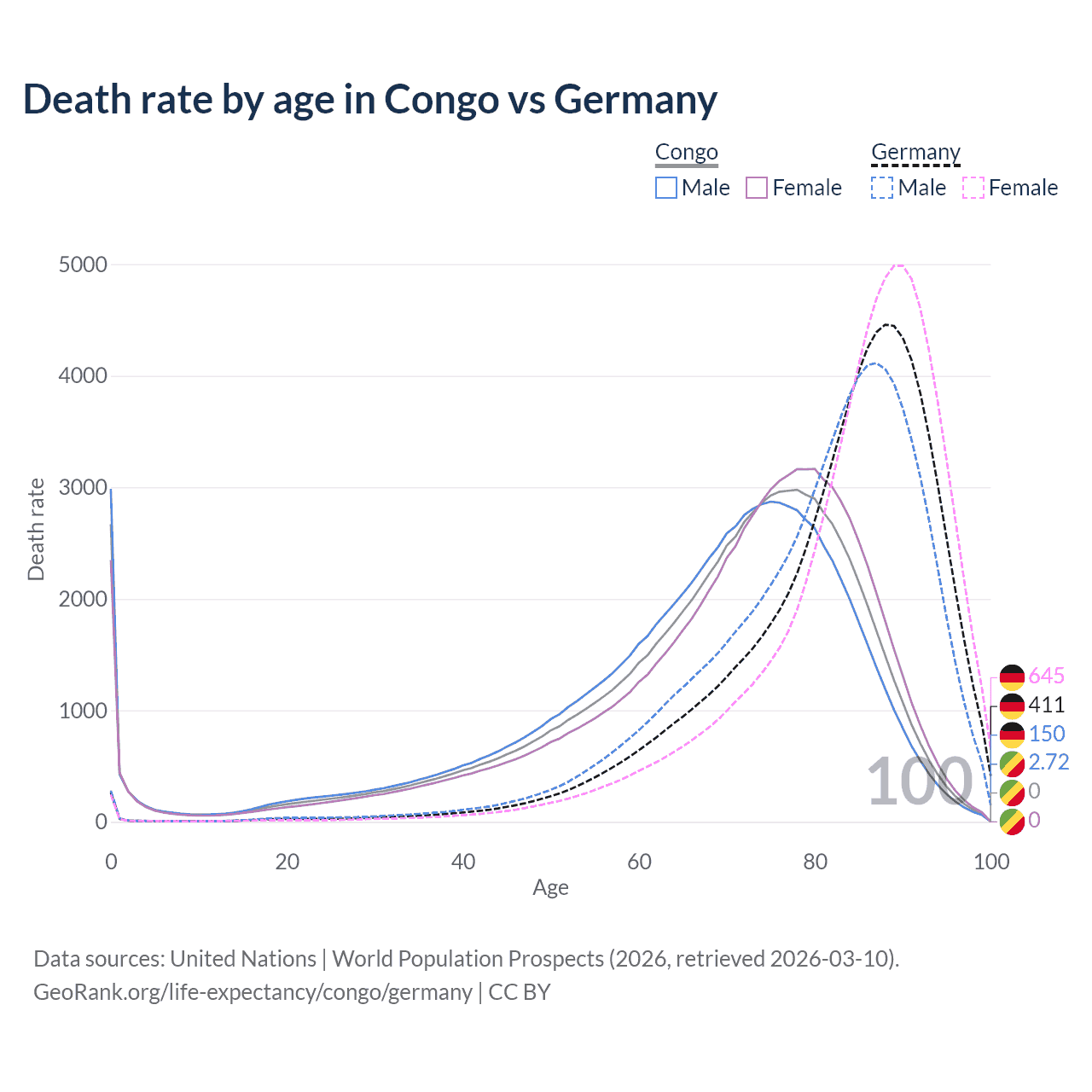 In the Congo, the most common age of death is 78, compared to 88 in Germany. The median age of death is 71.8 in the Congo and 85.1 in Germany, meaning only half of each cohort is expected to live past that age.