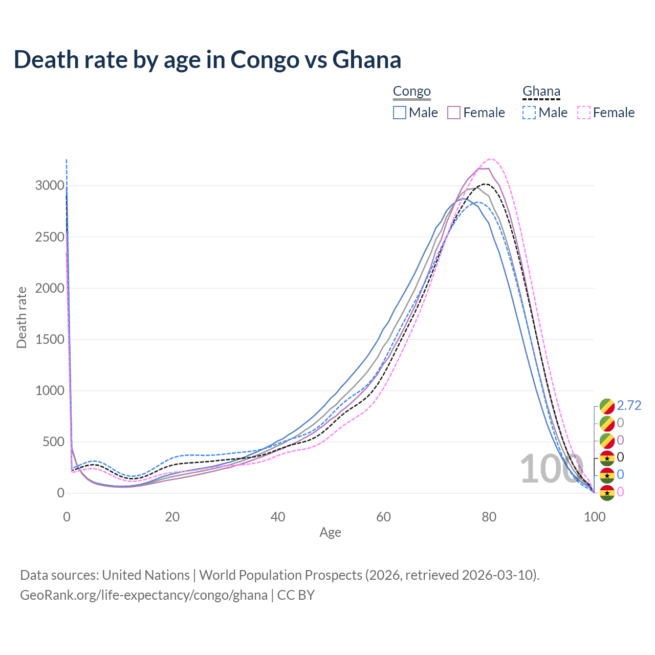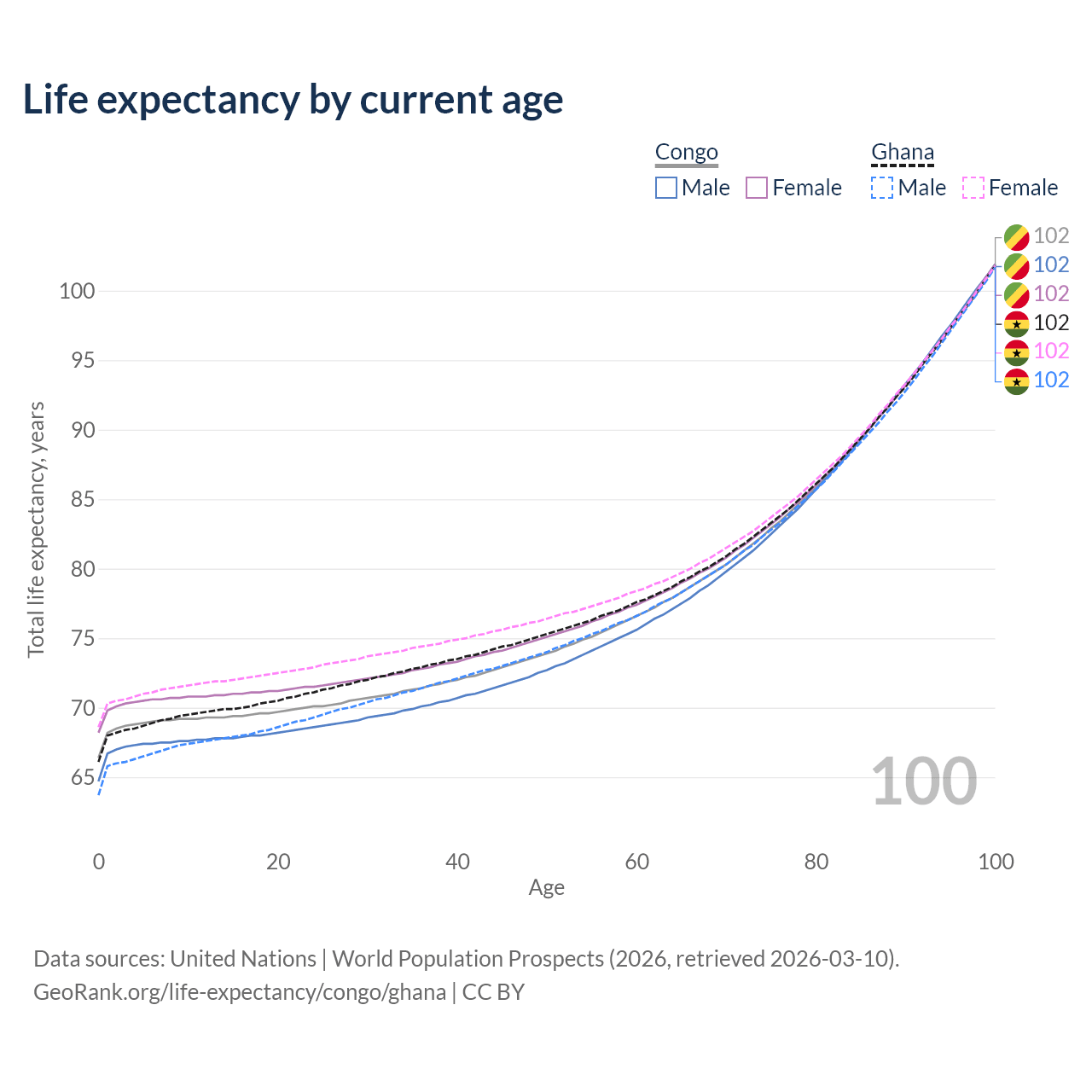 The average life expectancy at birth is 66.4 years in the Congo vs 66.1 in Ghana. The Congo is ranked 168/197 by life expectancy, and Ghana is 169/197. In the Congo, the life expectancy is 64.7 years for males and 68.2 years for females. In Ghana, it's 63.7 years for males and 68.6 years for females.