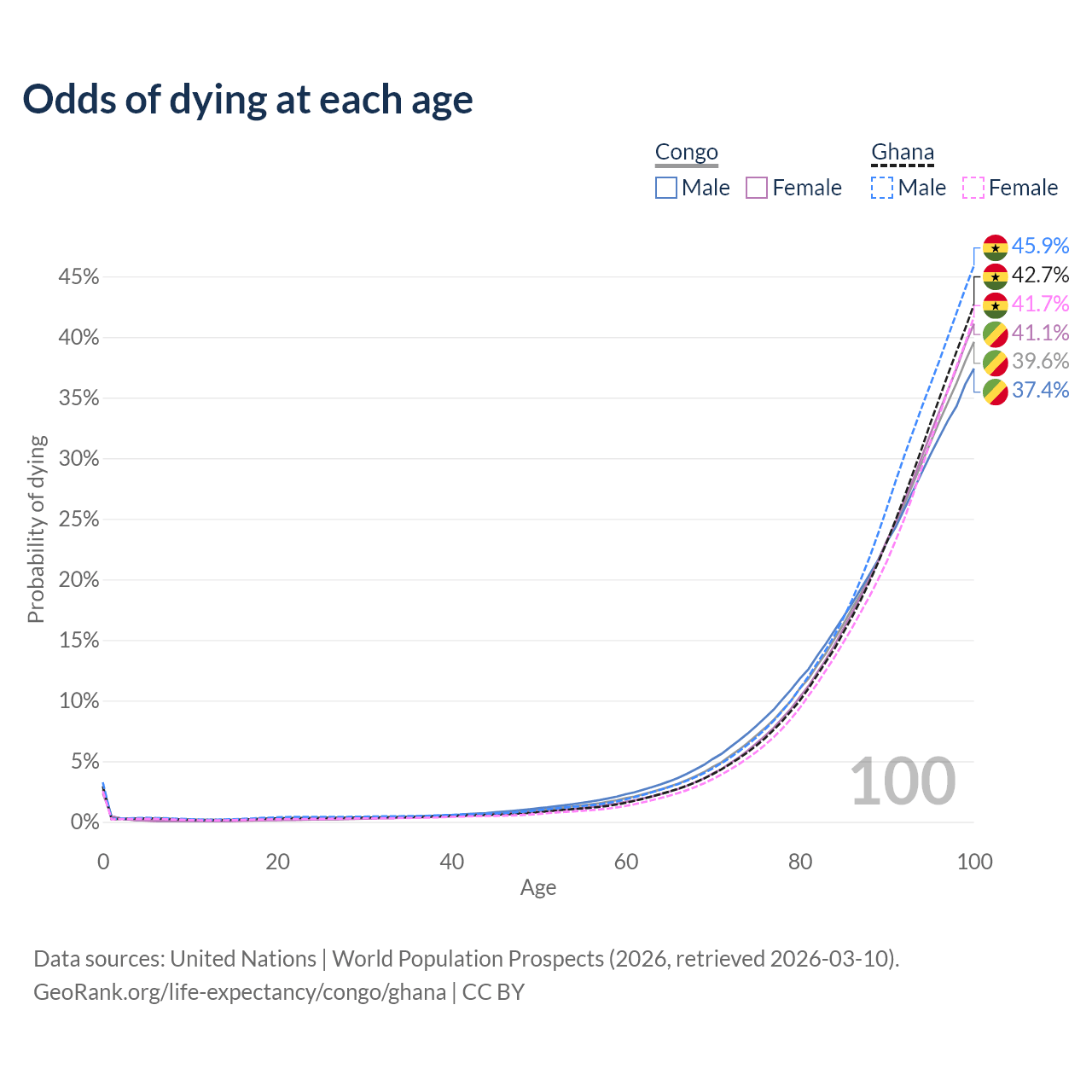 This life expectancy calculator shows the odds of living to 100, 95, 90, and below based on current age for both males and females in the Congo and Ghana, along with mean and median age of death. The calculations are based on the 2026 life tables (actuarial tables) from the UN World Population Prospects.