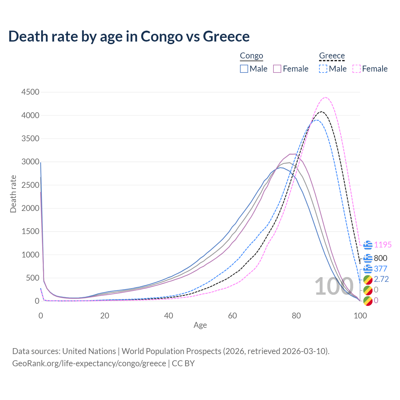 In the Congo, the most common age of death is 78, compared to 88 in Greece. The median age of death is 71.8 in the Congo and 84.9 in Greece, meaning only half of each cohort is expected to live past that age.