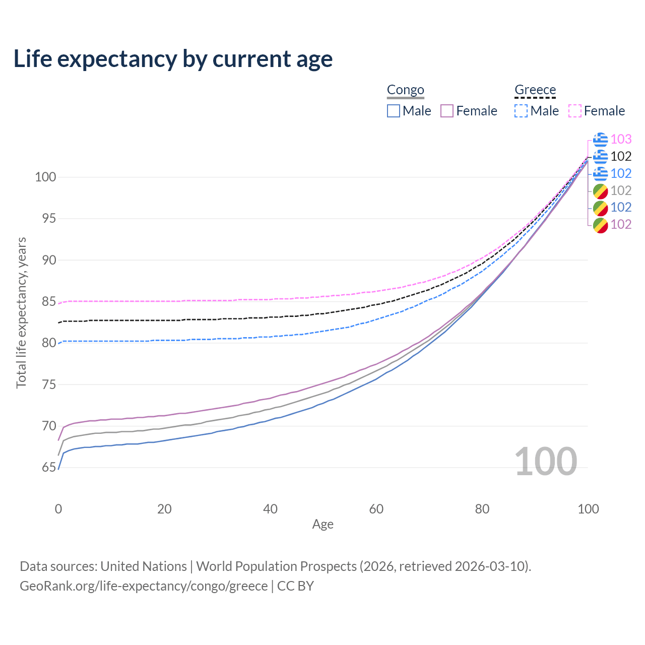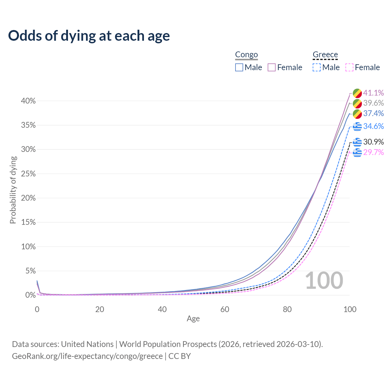 This life expectancy calculator shows the odds of living to 100, 95, 90, and below based on current age for both males and females in the Congo and Greece, along with mean and median age of death. The calculations are based on the 2026 life tables (actuarial tables) from the UN World Population Prospects.