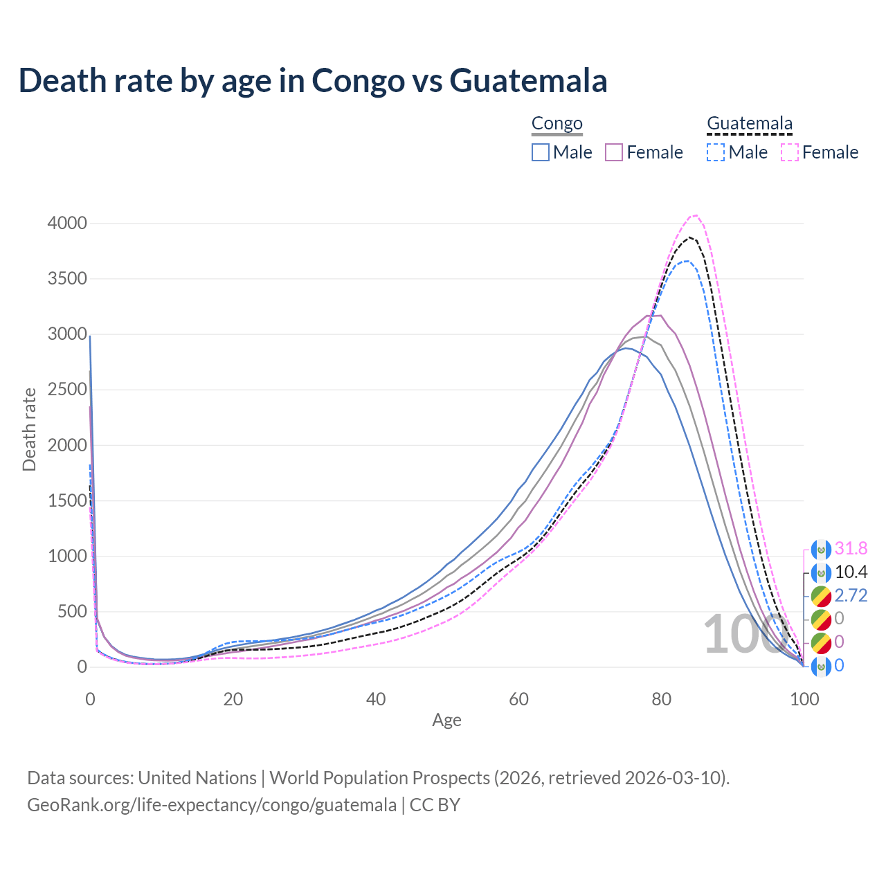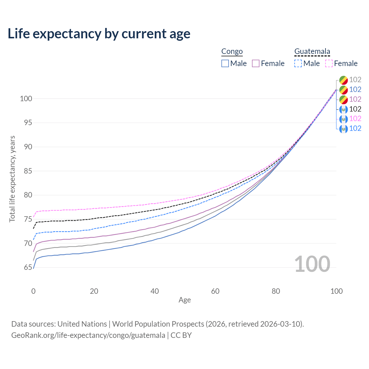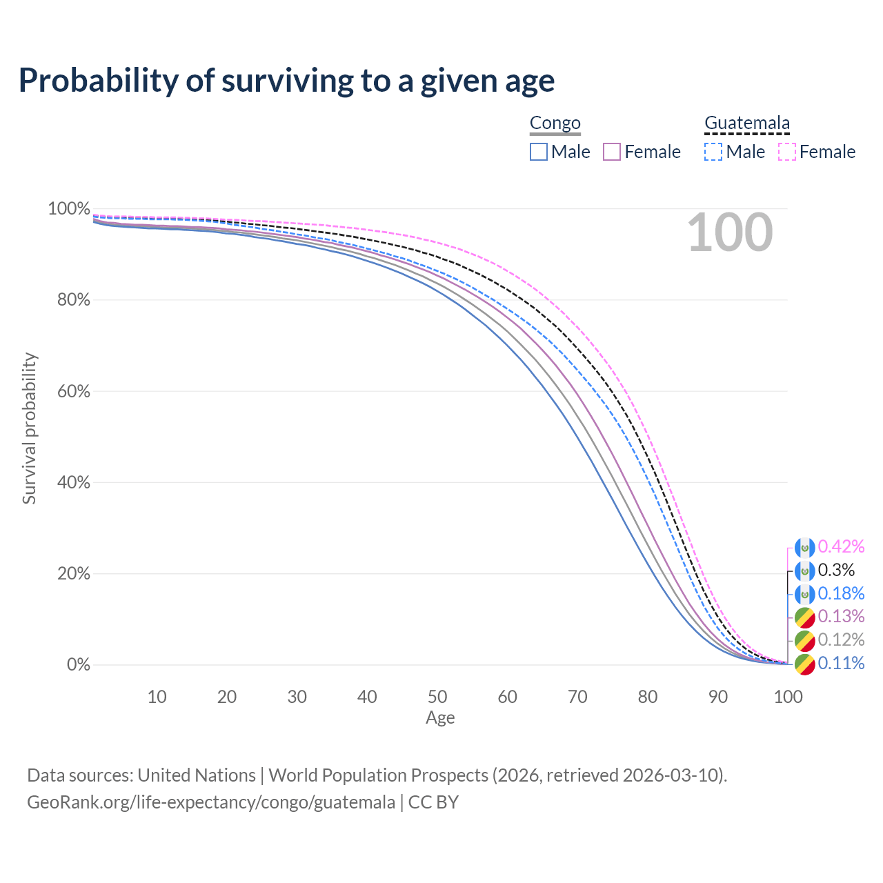 This life expectancy calculator shows the odds of living to 100, 95, 90, and below based on current age for both males and females in the Congo and Guatemala, along with mean and median age of death. The calculations are based on the 2026 life tables (actuarial tables) from the UN World Population Prospects.