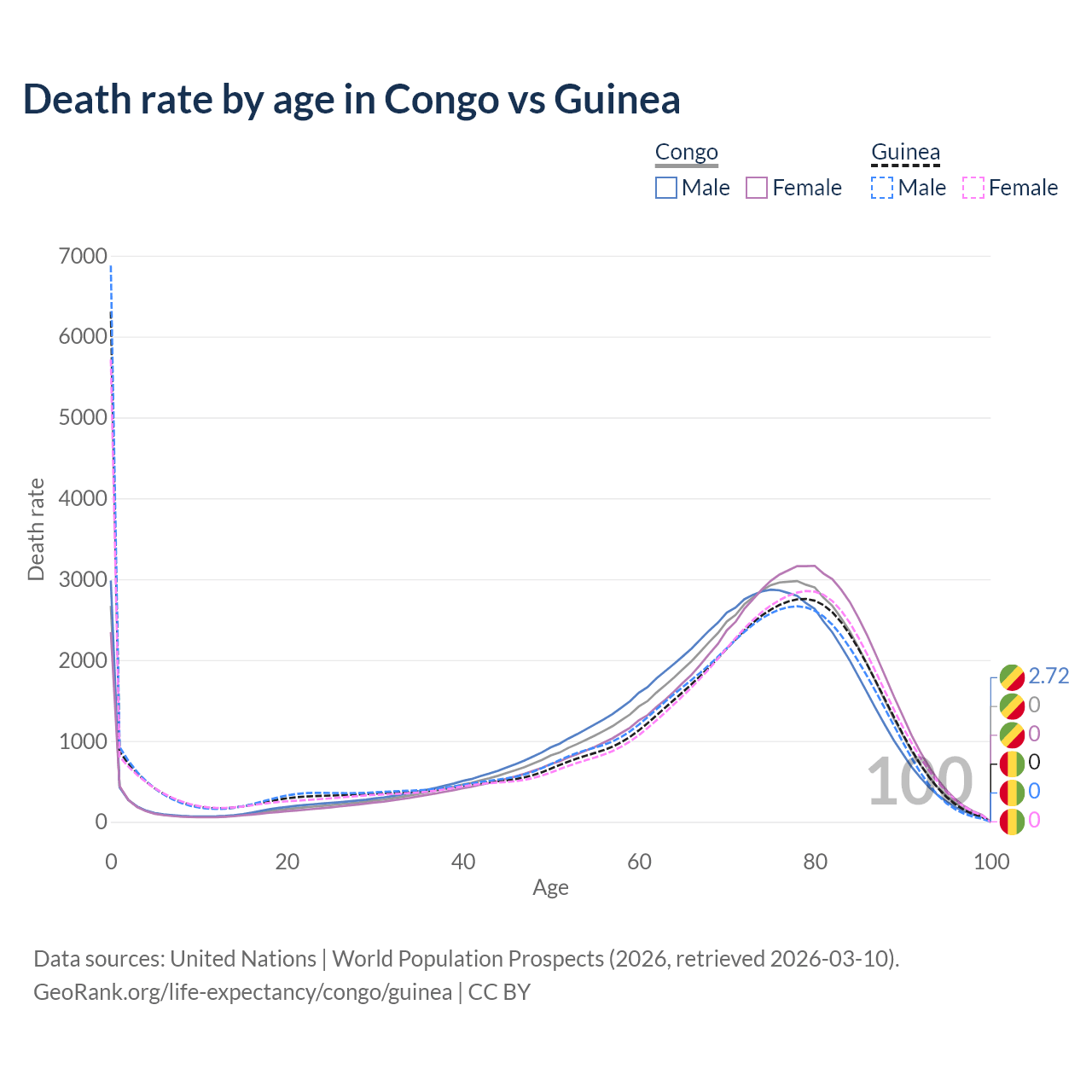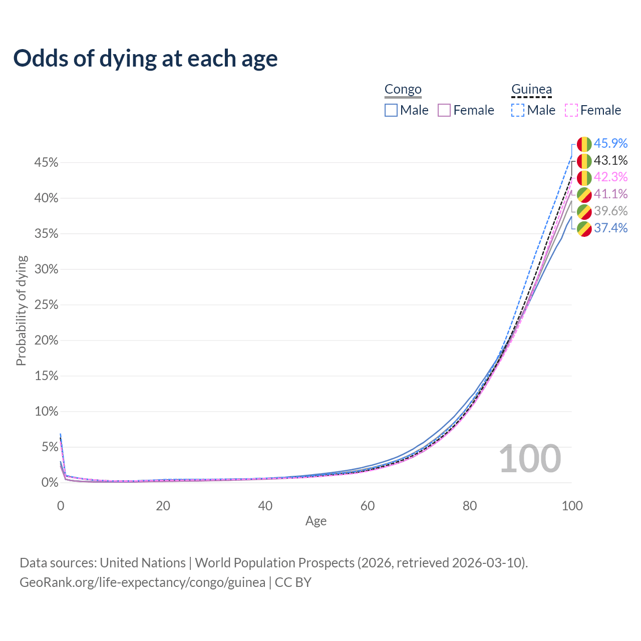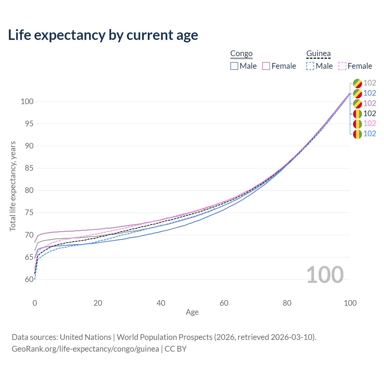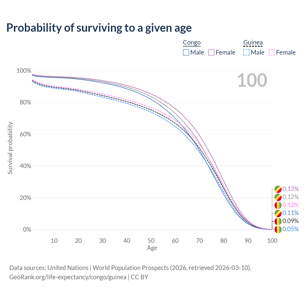 This life expectancy calculator shows the odds of living to 100, 95, 90, and below based on current age for both males and females in the Congo and Guinea, along with mean and median age of death. The calculations are based on the 2026 life tables (actuarial tables) from the UN World Population Prospects.