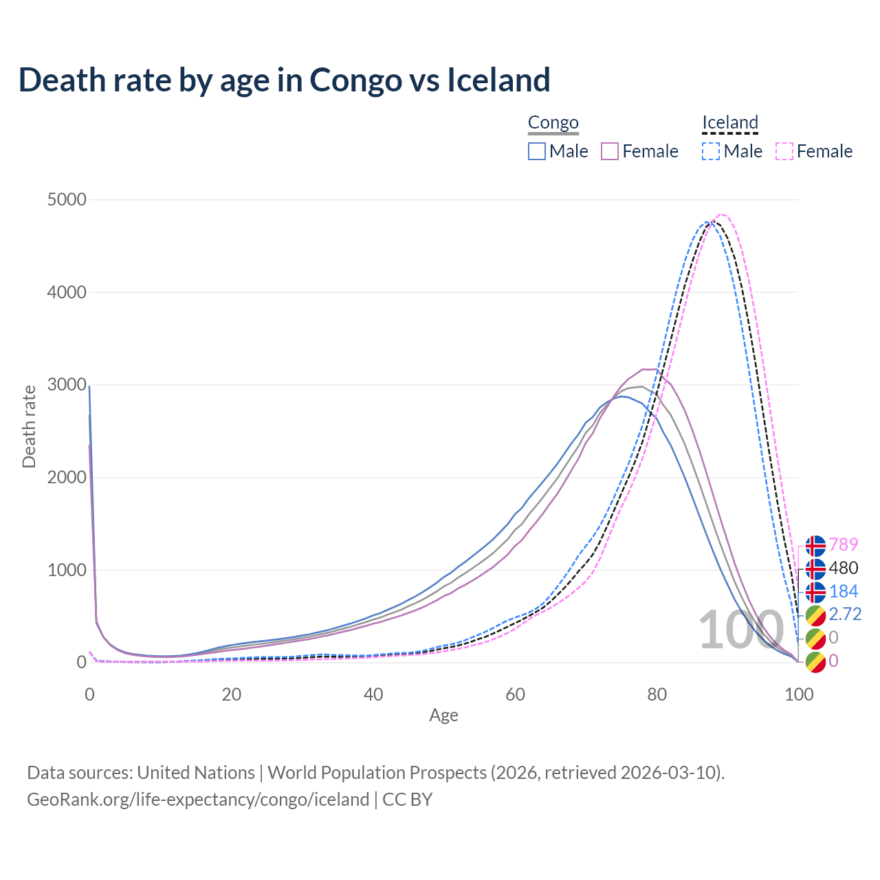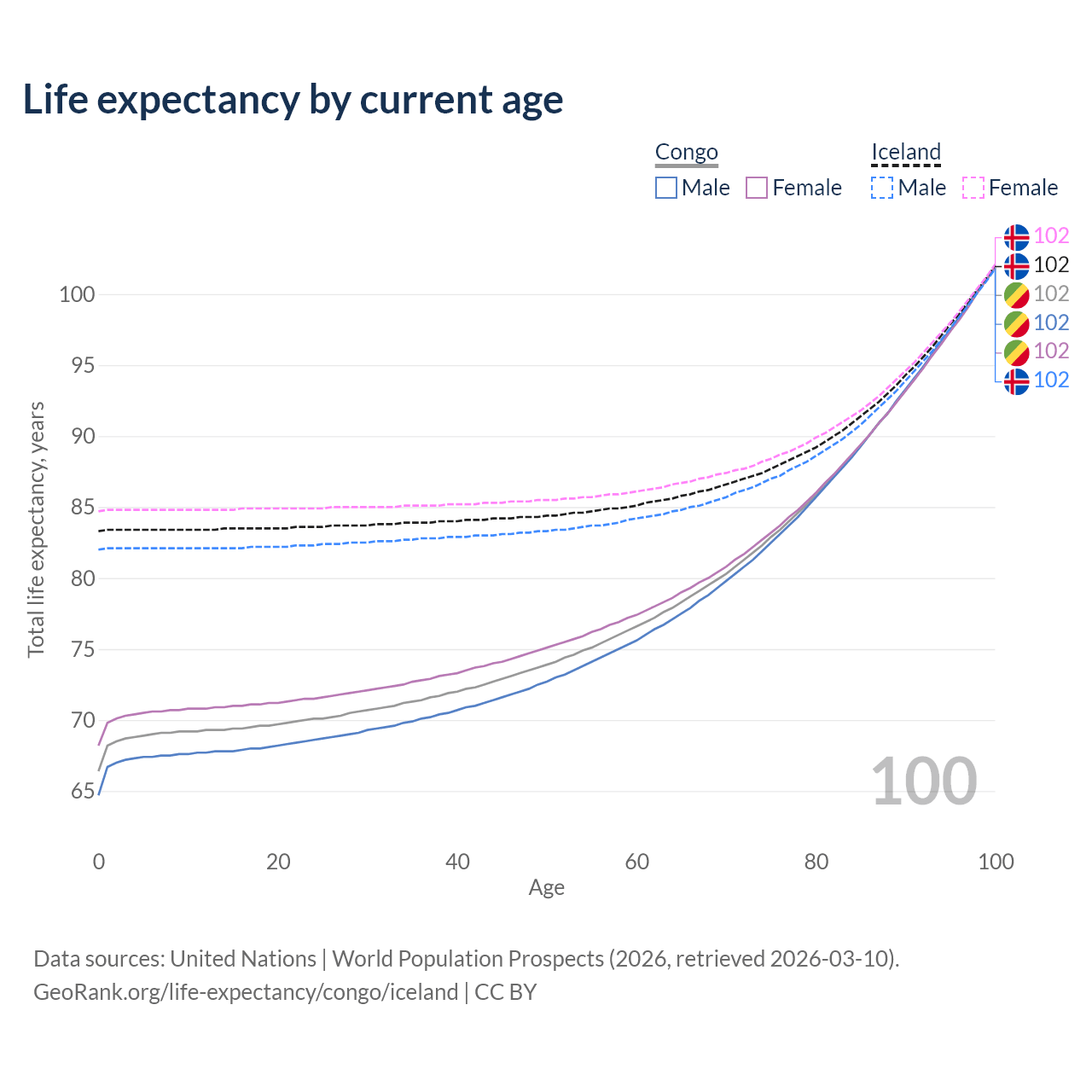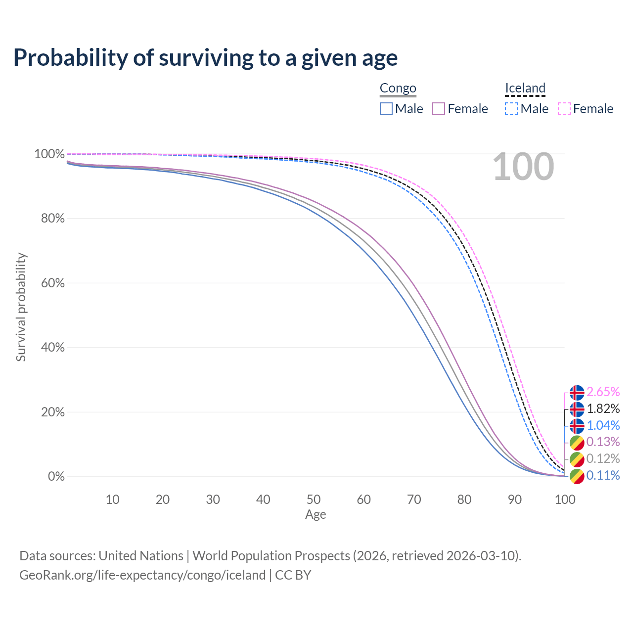 This life expectancy calculator shows the odds of living to 100, 95, 90, and below based on current age for both males and females in the Congo and Iceland, along with mean and median age of death. The calculations are based on the 2026 life tables (actuarial tables) from the UN World Population Prospects.