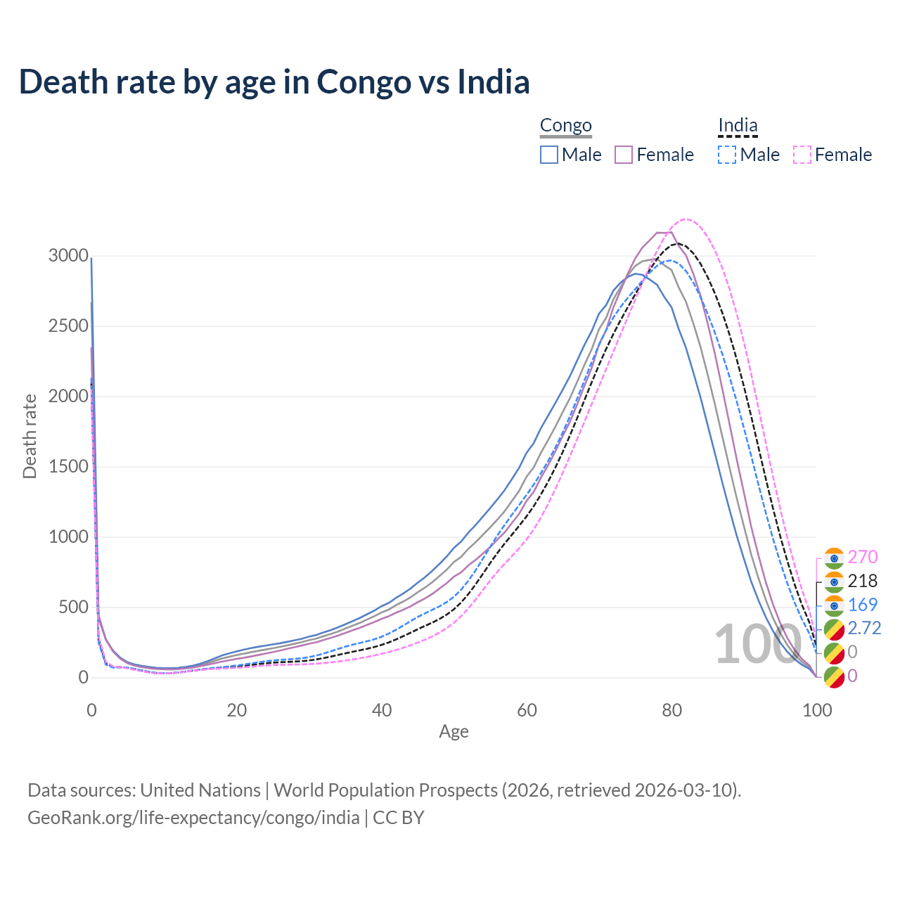 In the Congo, the most common age of death is 78, compared to 81 in India. The median age of death is 71.8 in the Congo and 76.8 in India, meaning only half of each cohort is expected to live past that age.
