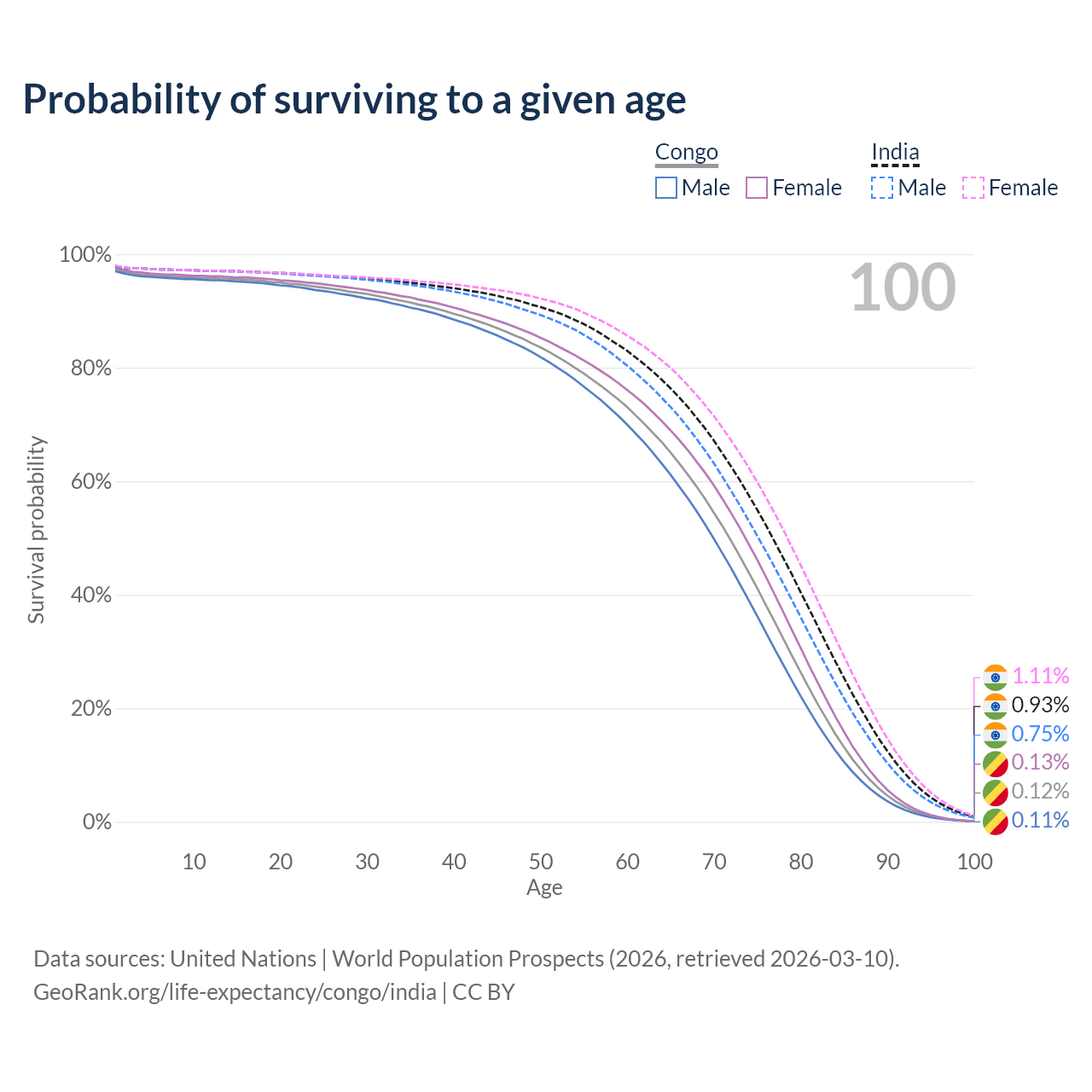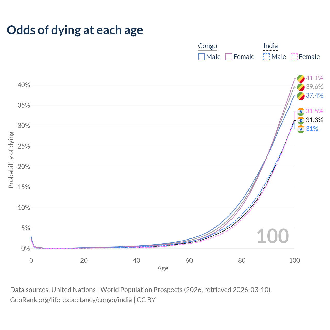 This life expectancy calculator shows the odds of living to 100, 95, 90, and below based on current age for both males and females in the Congo and India, along with mean and median age of death. The calculations are based on the 2026 life tables (actuarial tables) from the UN World Population Prospects.
