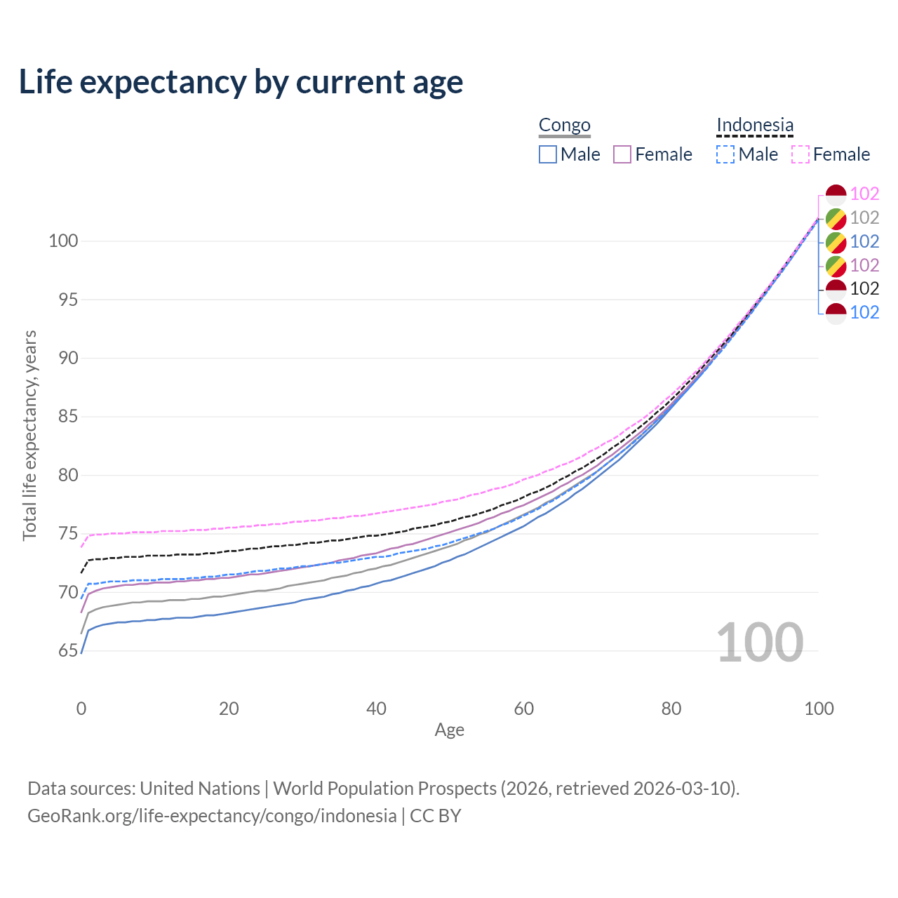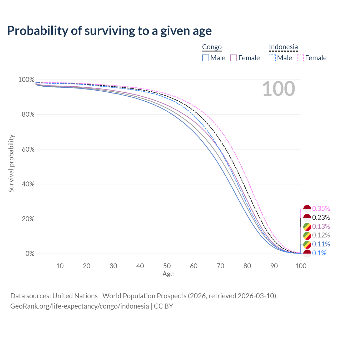 This life expectancy calculator shows the odds of living to 100, 95, 90, and below based on current age for both males and females in the Congo and Indonesia, along with mean and median age of death. The calculations are based on the 2026 life tables (actuarial tables) from the UN World Population Prospects.