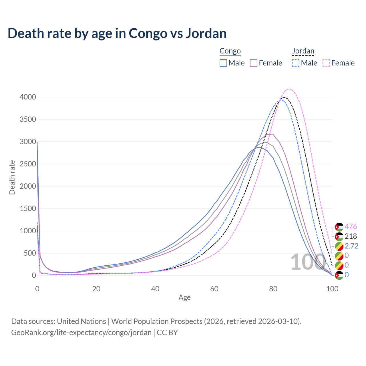 In the Congo, the most common age of death is 78, compared to 84 in Jordan. The median age of death is 71.8 in the Congo and 81.3 in Jordan, meaning only half of each cohort is expected to live past that age.