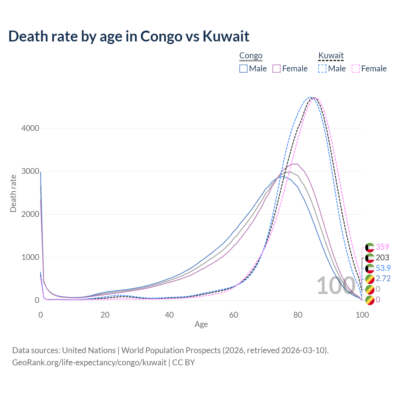 In the Congo, the most common age of death is 78, compared to 85 in Kuwait. The median age of death is 71.8 in the Congo and 83.3 in Kuwait, meaning only half of each cohort is expected to live past that age.