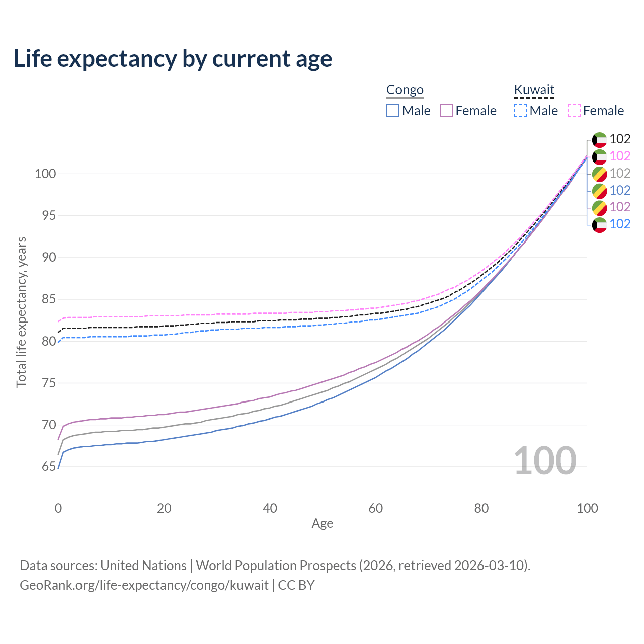 This life expectancy calculator shows the odds of living to 100, 95, 90, and below based on current age for both males and females in the Congo and Kuwait, along with mean and median age of death. The calculations are based on the 2026 life tables (actuarial tables) from the UN World Population Prospects.
