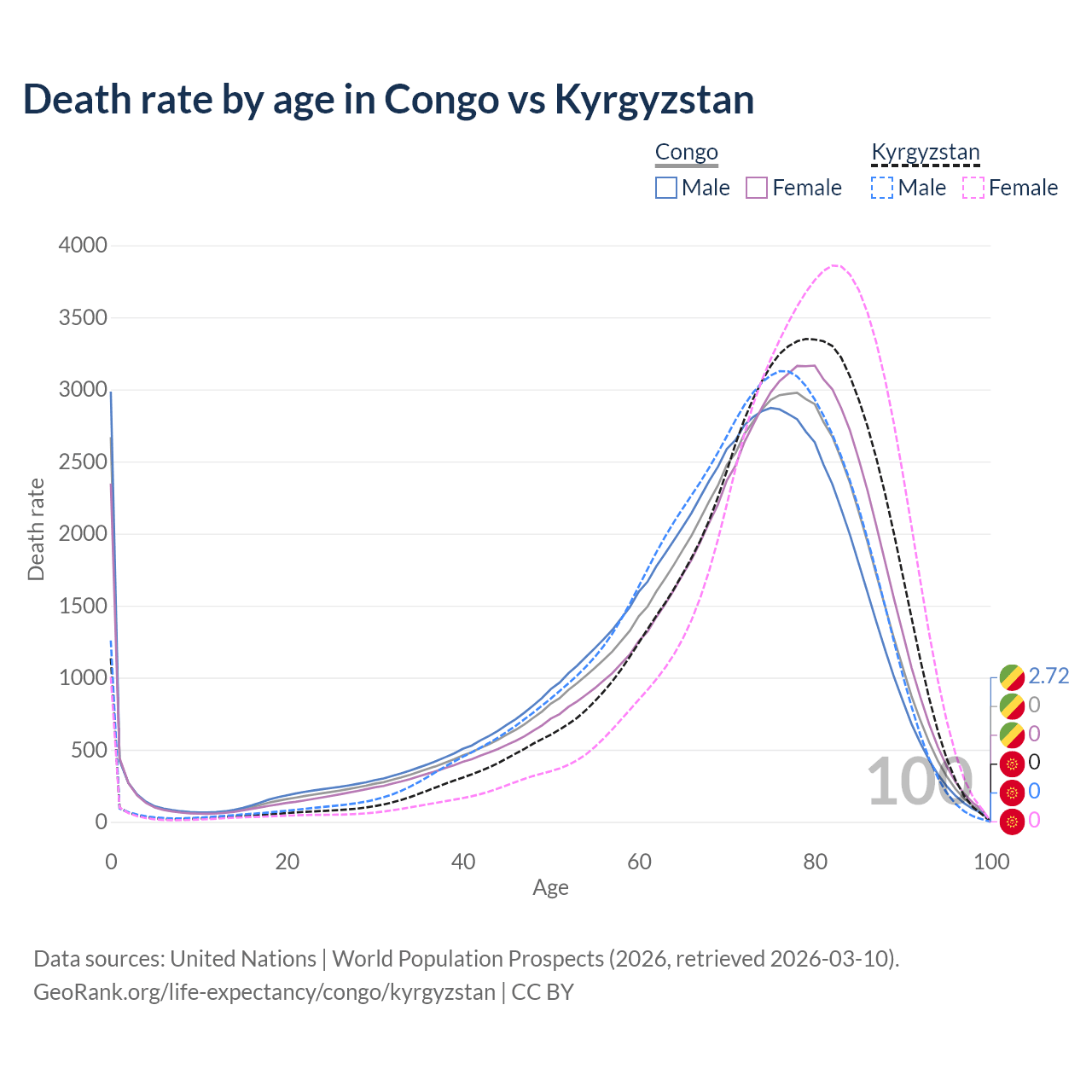 In the Congo, the most common age of death is 78, compared to 79 in Kyrgyzstan. The median age of death is 71.8 in the Congo and 75.6 in Kyrgyzstan, meaning only half of each cohort is expected to live past that age.