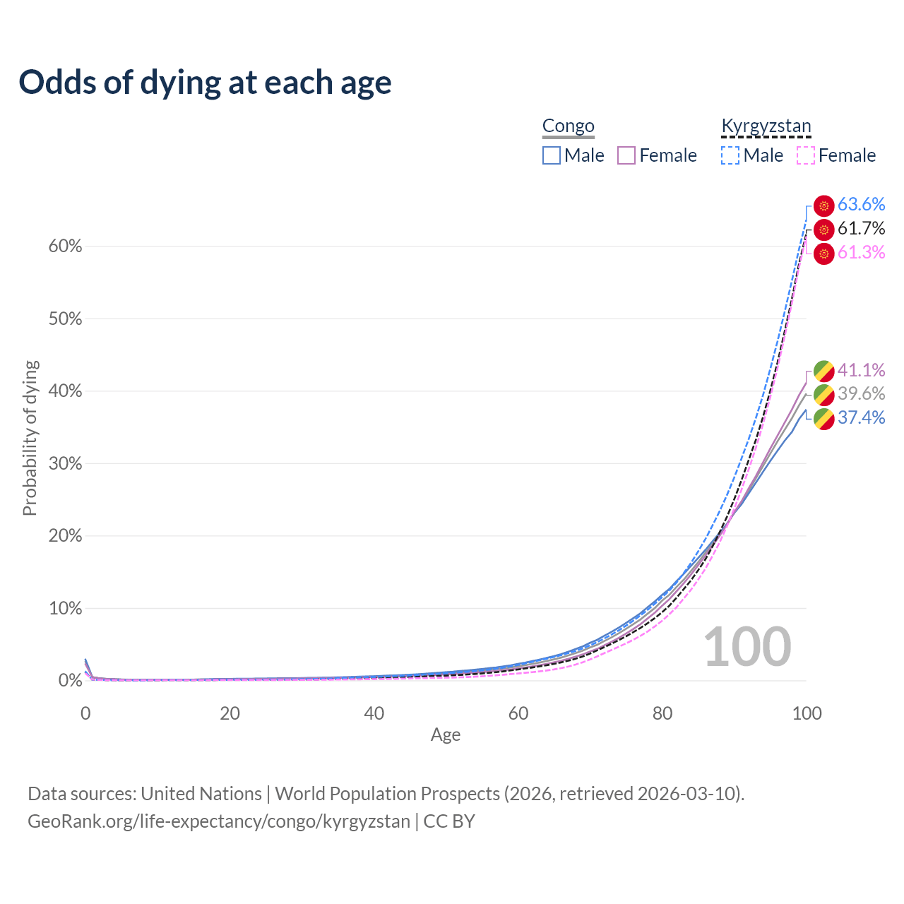 This life expectancy calculator shows the odds of living to 100, 95, 90, and below based on current age for both males and females in the Congo and Kyrgyzstan, along with mean and median age of death. The calculations are based on the 2026 life tables (actuarial tables) from the UN World Population Prospects.