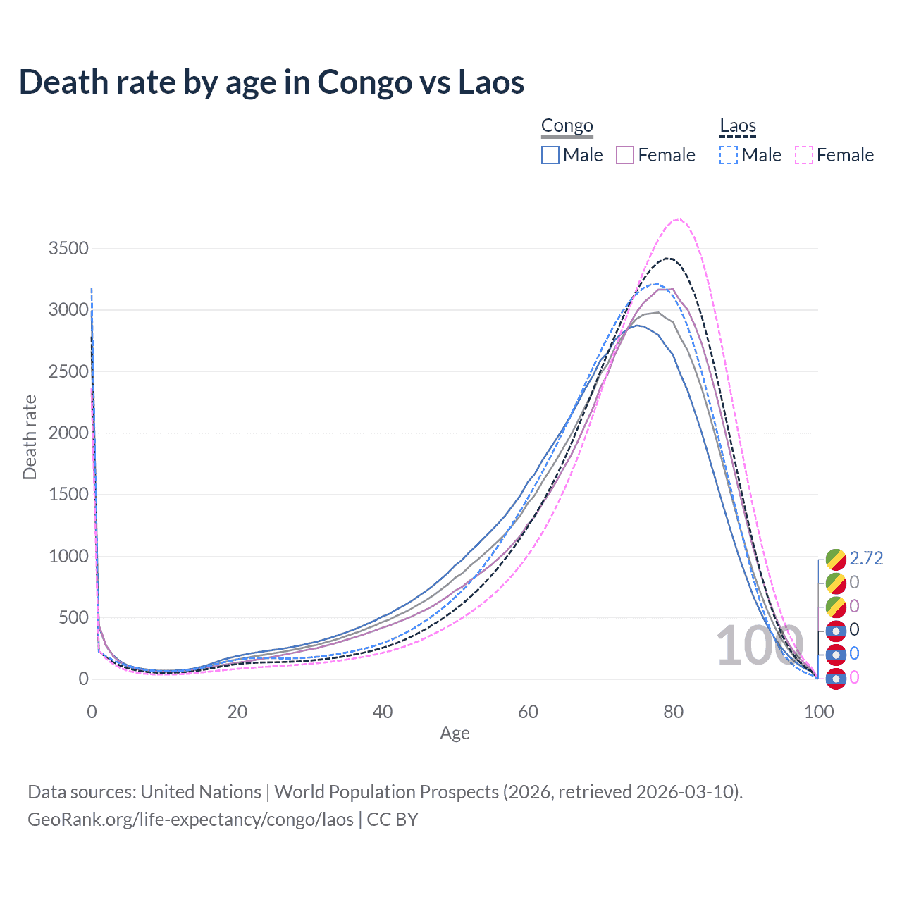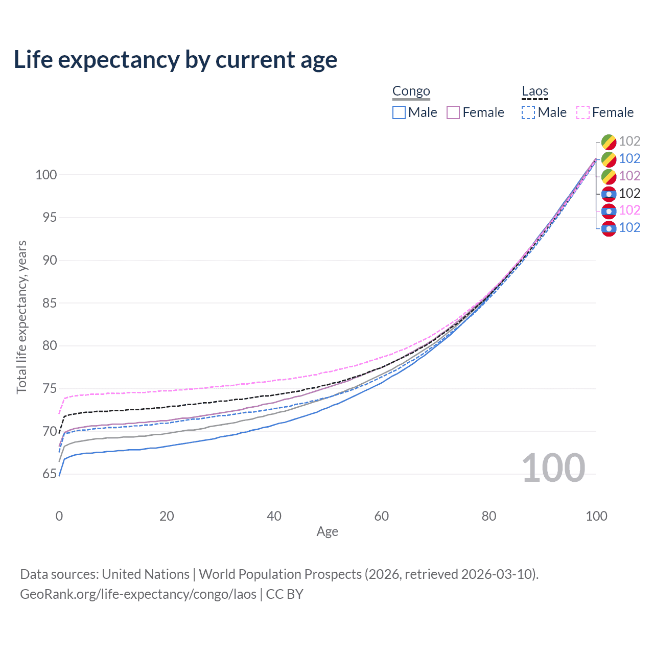 This life expectancy calculator shows the odds of living to 100, 95, 90, and below based on current age for both males and females in the Congo and Laos, along with mean and median age of death. The calculations are based on the 2026 life tables (actuarial tables) from the UN World Population Prospects.