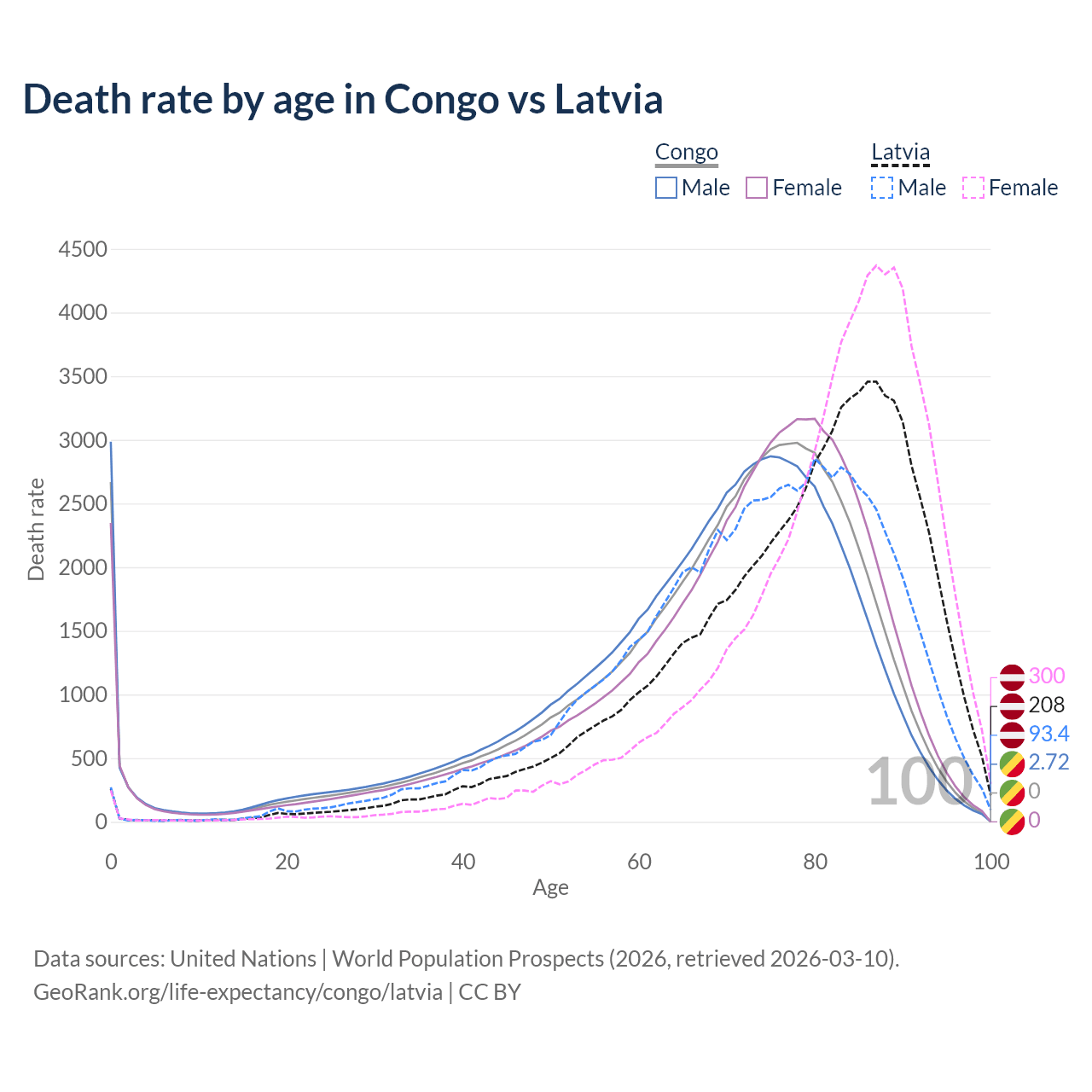 In the Congo, the most common age of death is 78, compared to 87 in Latvia. The median age of death is 71.8 in the Congo and 80.4 in Latvia, meaning only half of each cohort is expected to live past that age.