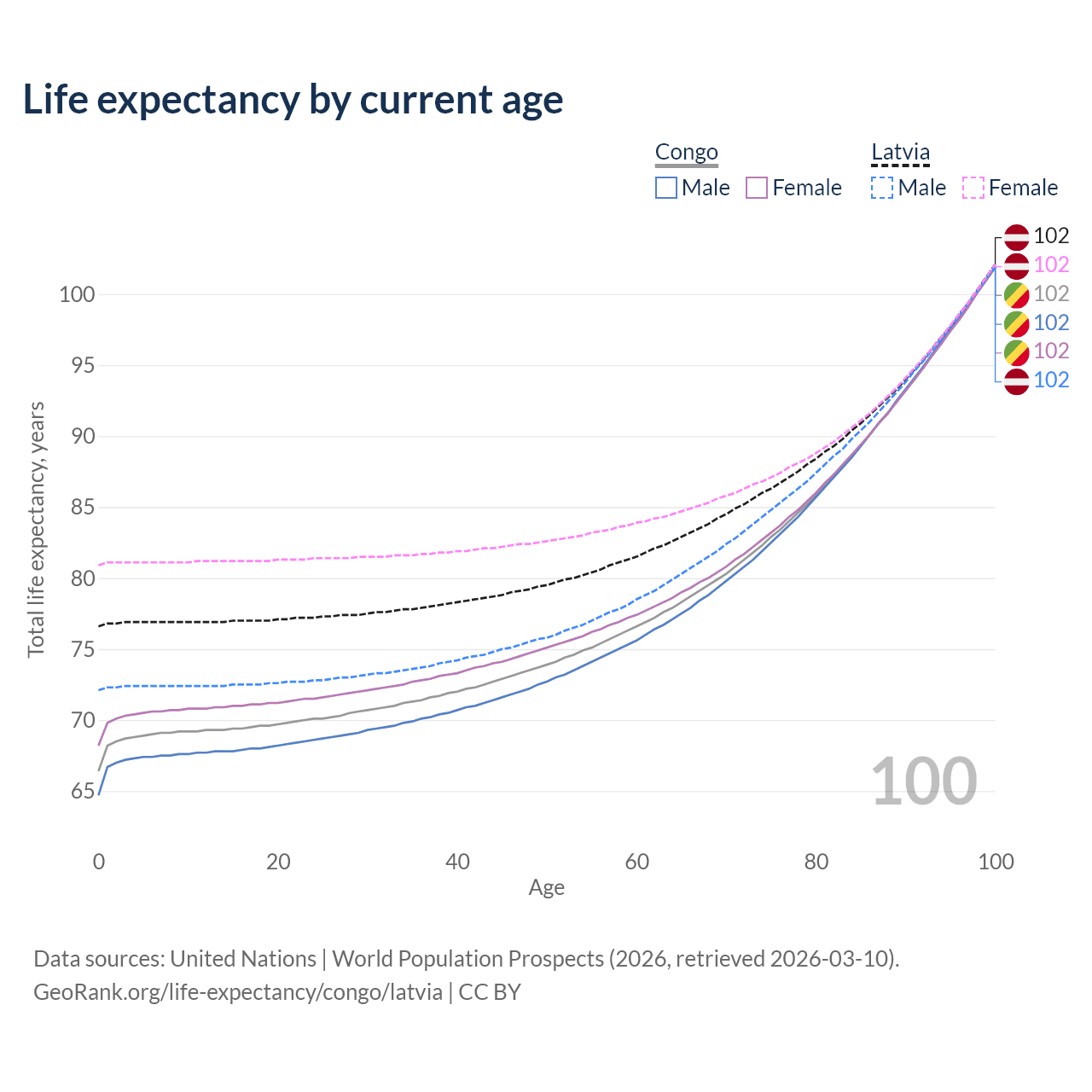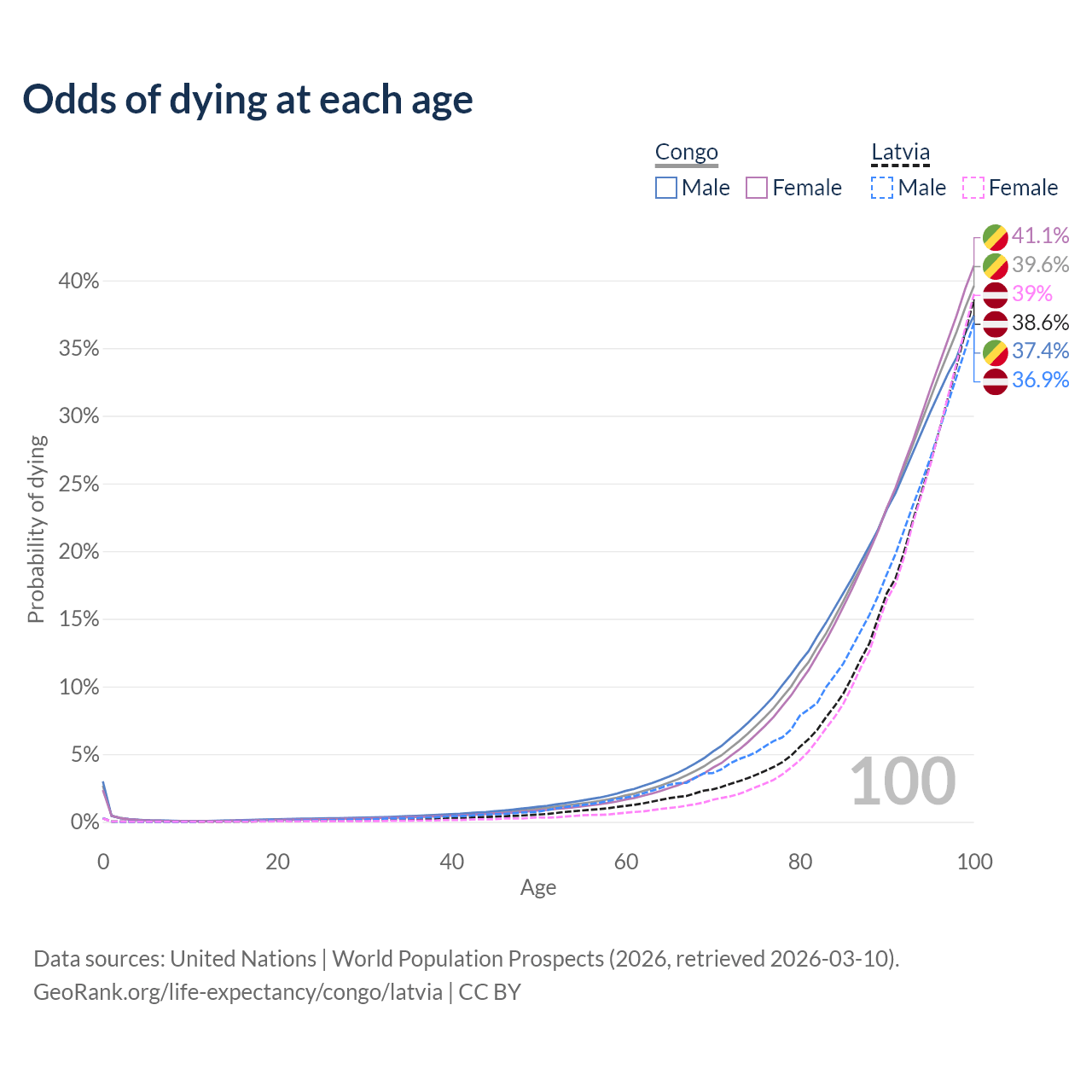 This life expectancy calculator shows the odds of living to 100, 95, 90, and below based on current age for both males and females in the Congo and Latvia, along with mean and median age of death. The calculations are based on the 2026 life tables (actuarial tables) from the UN World Population Prospects.
