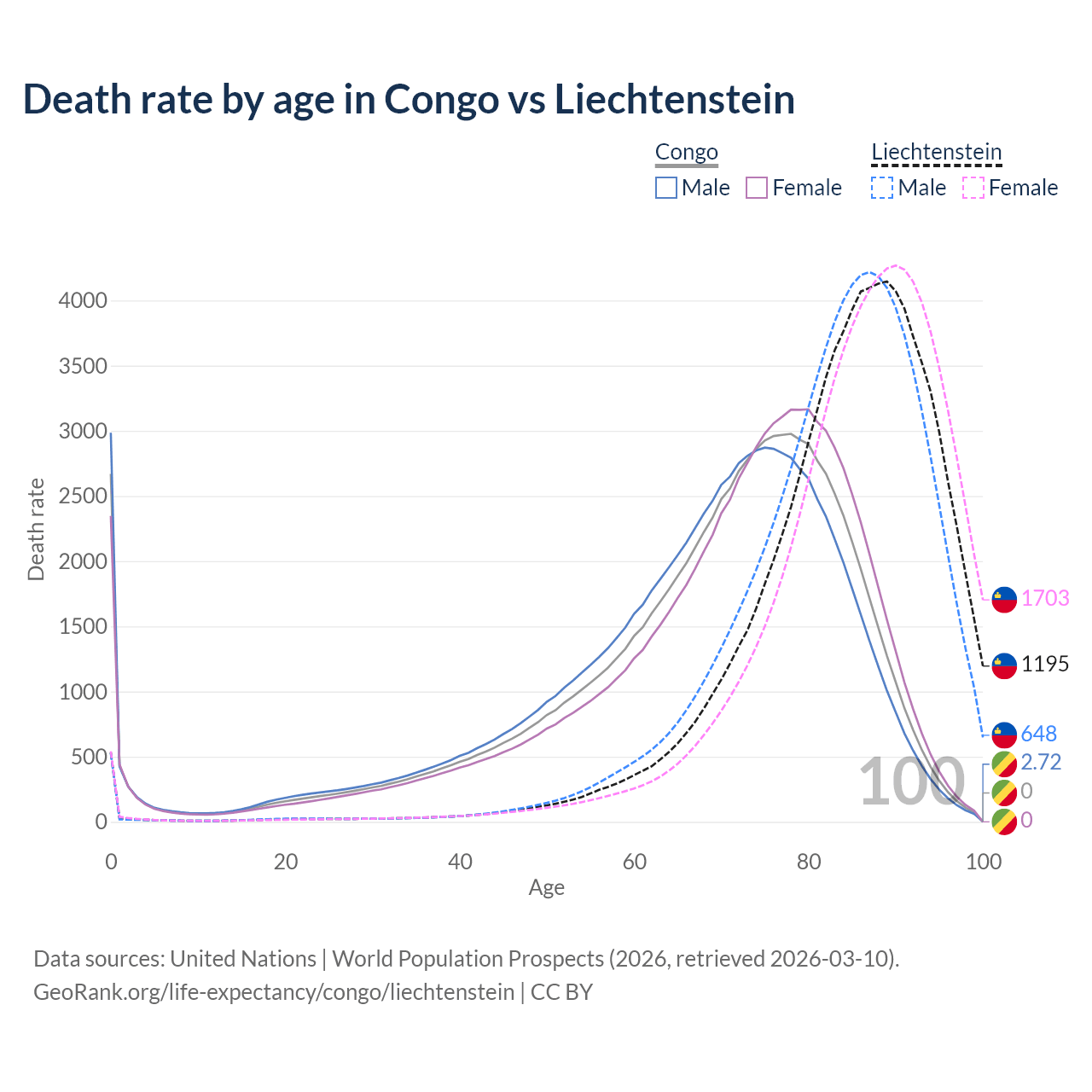 In the Congo, the most common age of death is 78, compared to 89 in Liechtenstein. The median age of death is 71.8 in the Congo and 86.3 in Liechtenstein, meaning only half of each cohort is expected to live past that age.