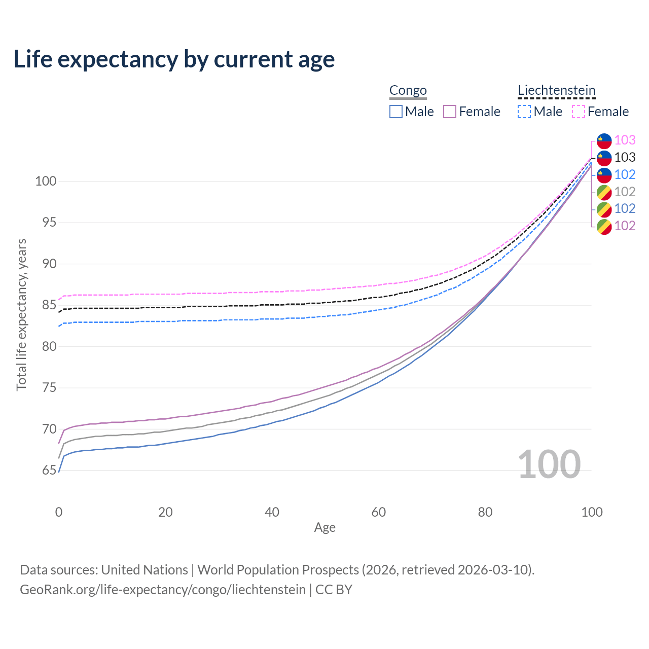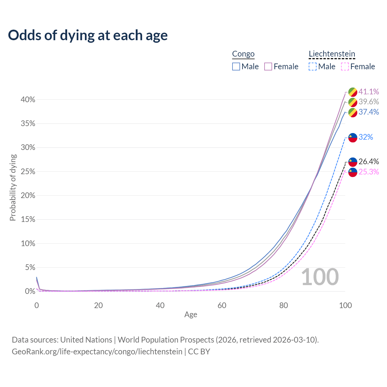 This life expectancy calculator shows the odds of living to 100, 95, 90, and below based on current age for both males and females in the Congo and Liechtenstein, along with mean and median age of death. The calculations are based on the 2026 life tables (actuarial tables) from the UN World Population Prospects.