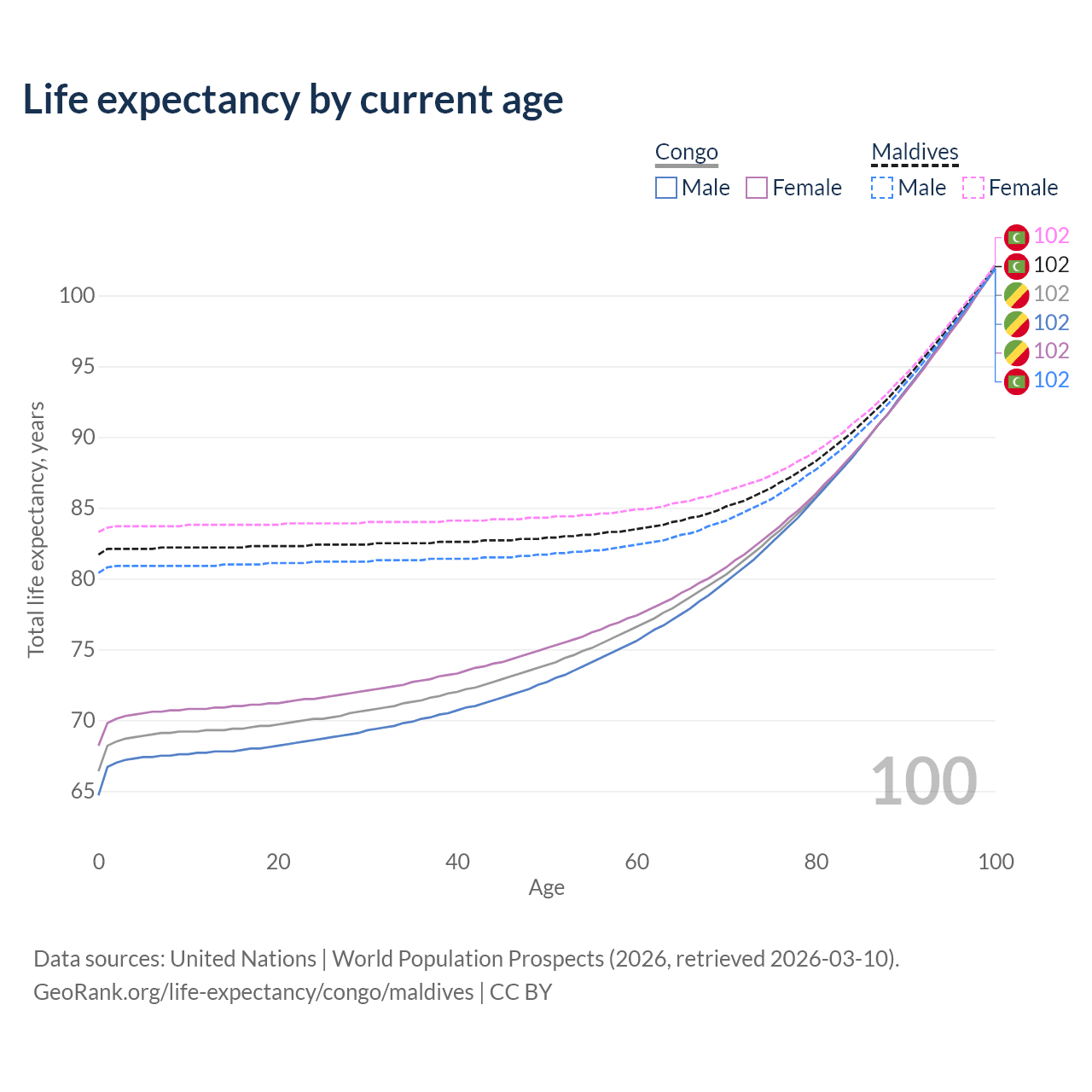 The average life expectancy at birth is 66.4 years in the Congo vs 81.7 in Maldives. The Congo is ranked 168/197 by life expectancy, and Maldives is 37/197. In the Congo, the life expectancy is 64.7 years for males and 68.2 years for females. In Maldives, it's 80.4 years for males and 83.3 years for females.