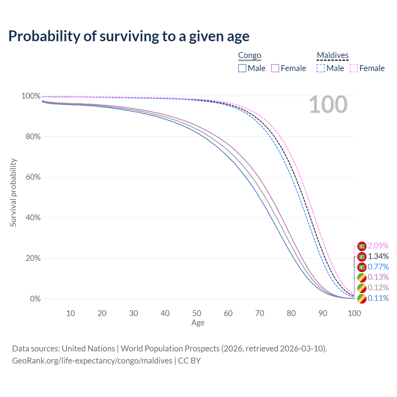 This life expectancy calculator shows the odds of living to 100, 95, 90, and below based on current age for both males and females in the Congo and Maldives, along with mean and median age of death. The calculations are based on the 2026 life tables (actuarial tables) from the UN World Population Prospects.