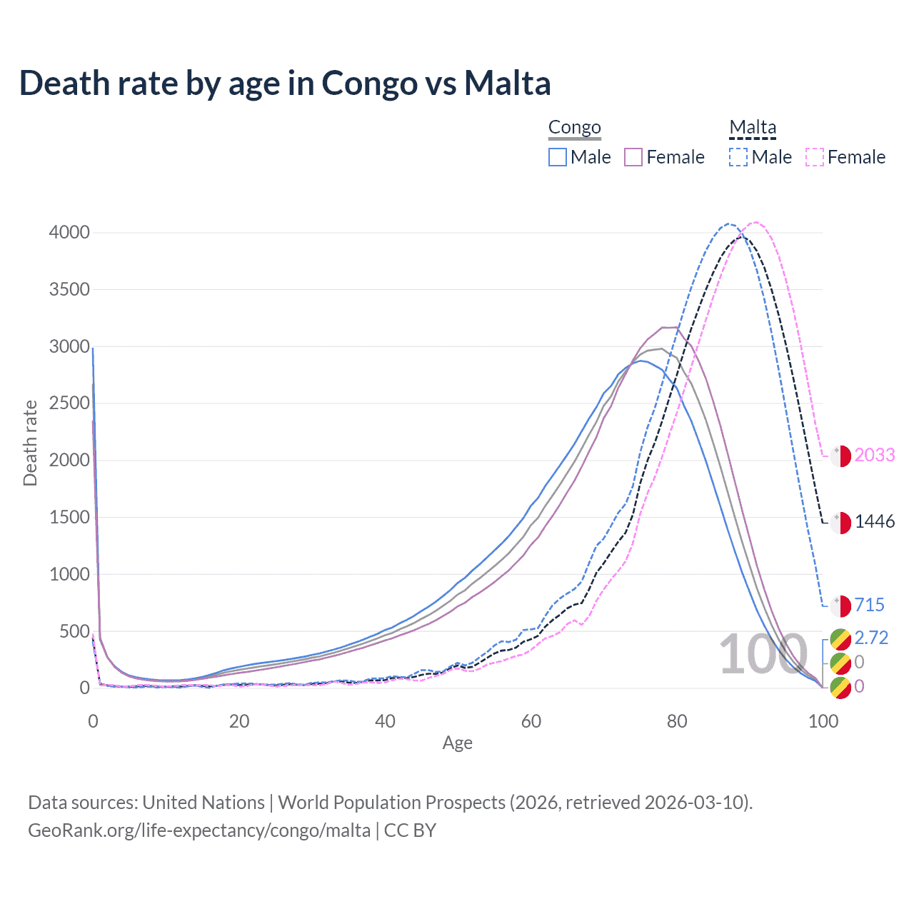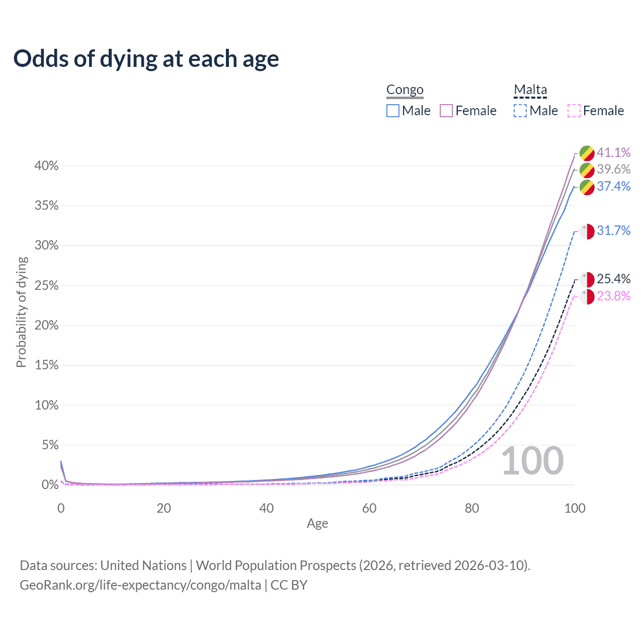 This life expectancy calculator shows the odds of living to 100, 95, 90, and below based on current age for both males and females in the Congo and Malta, along with mean and median age of death. The calculations are based on the 2026 life tables (actuarial tables) from the UN World Population Prospects.